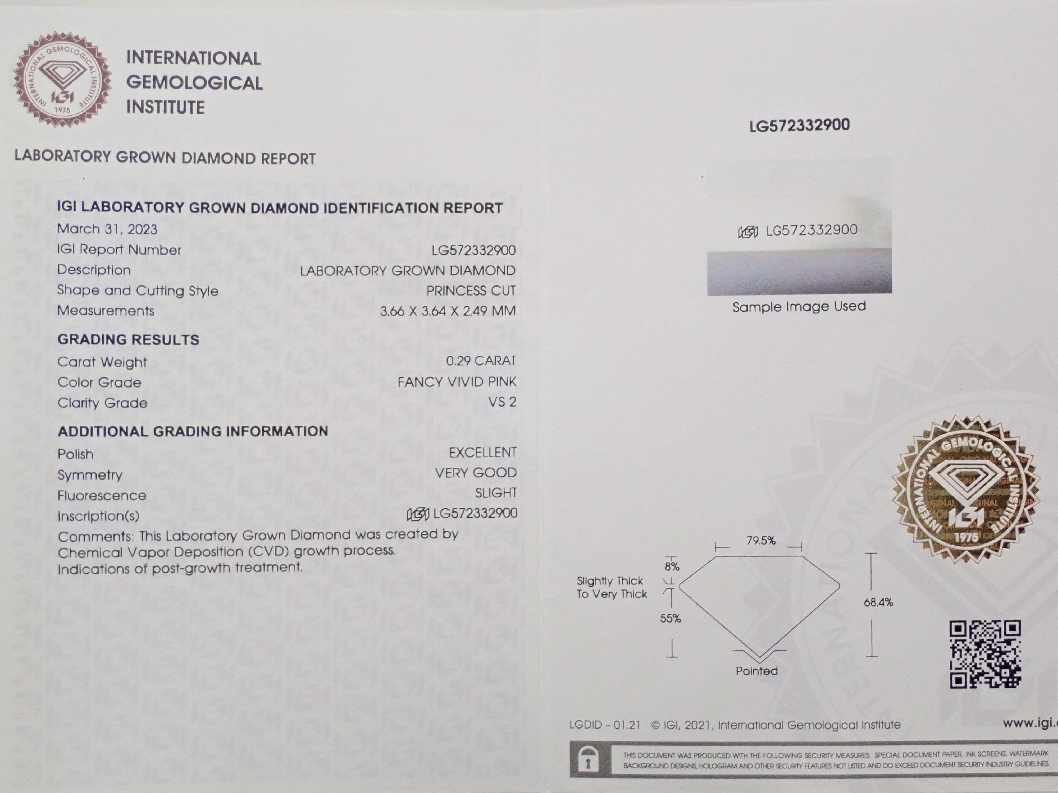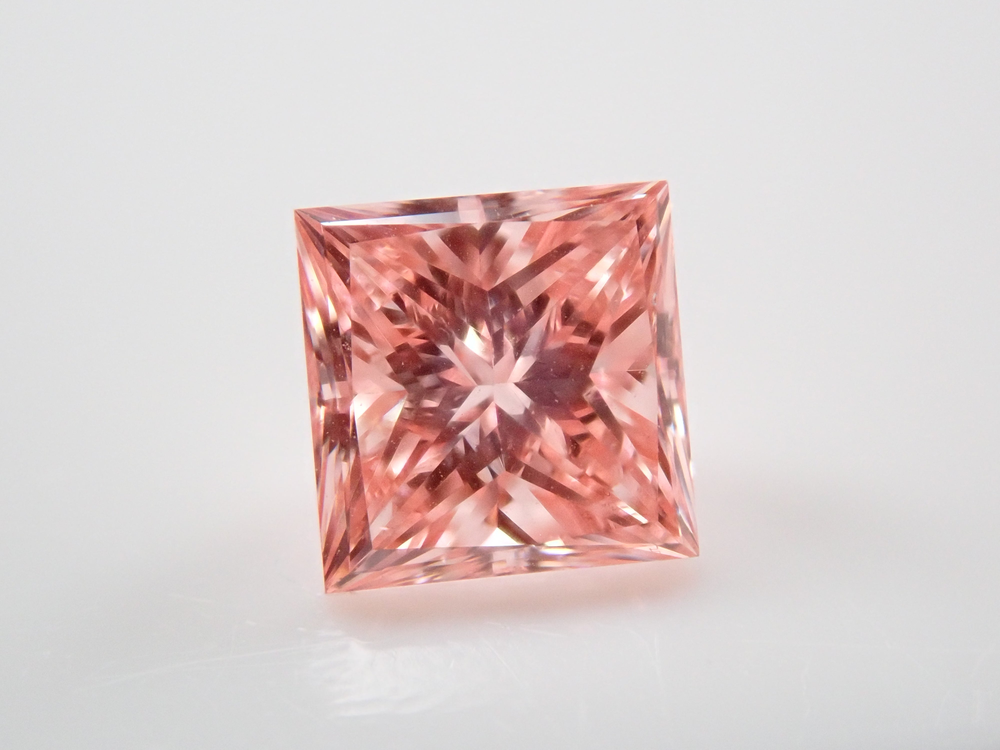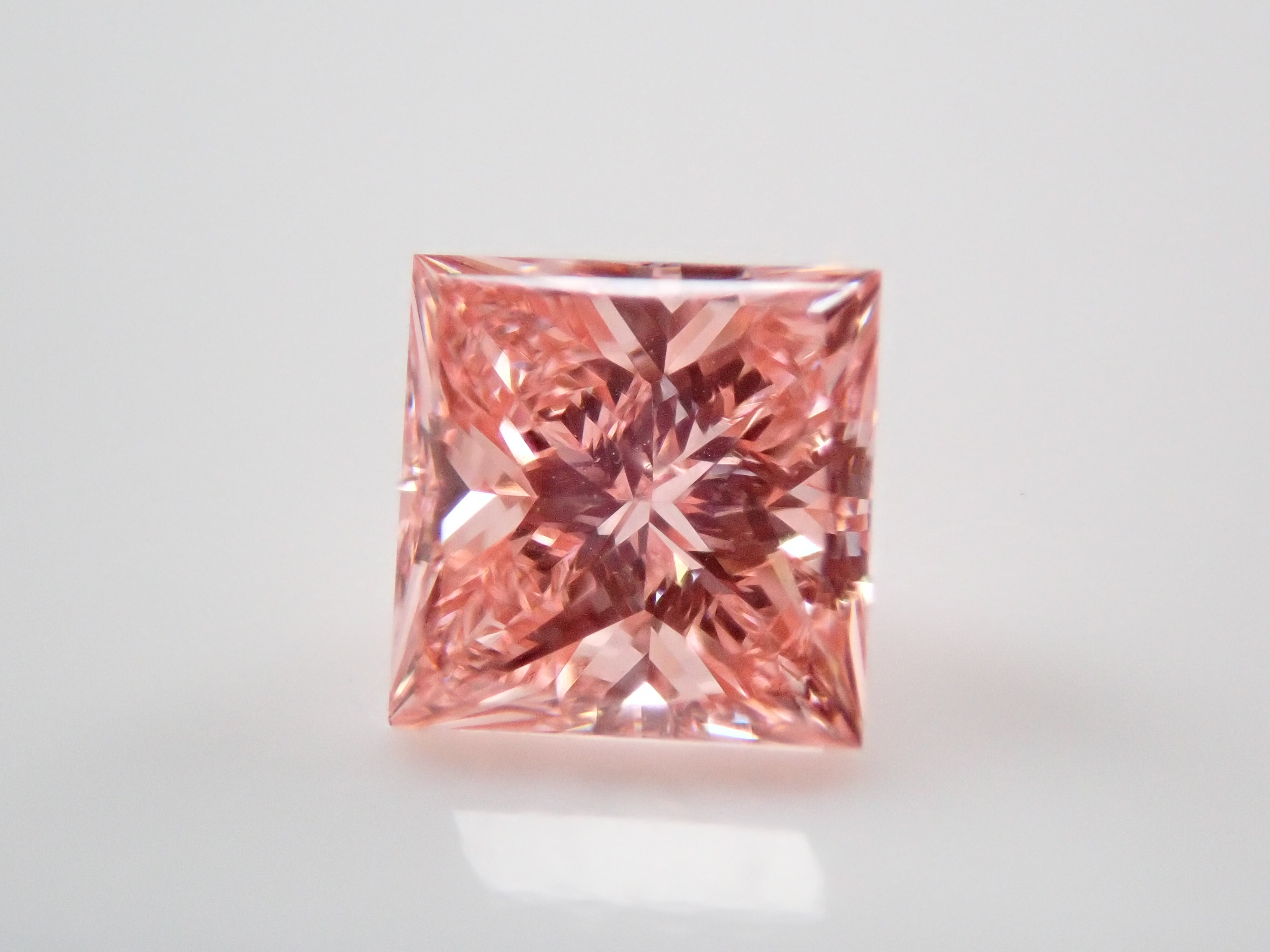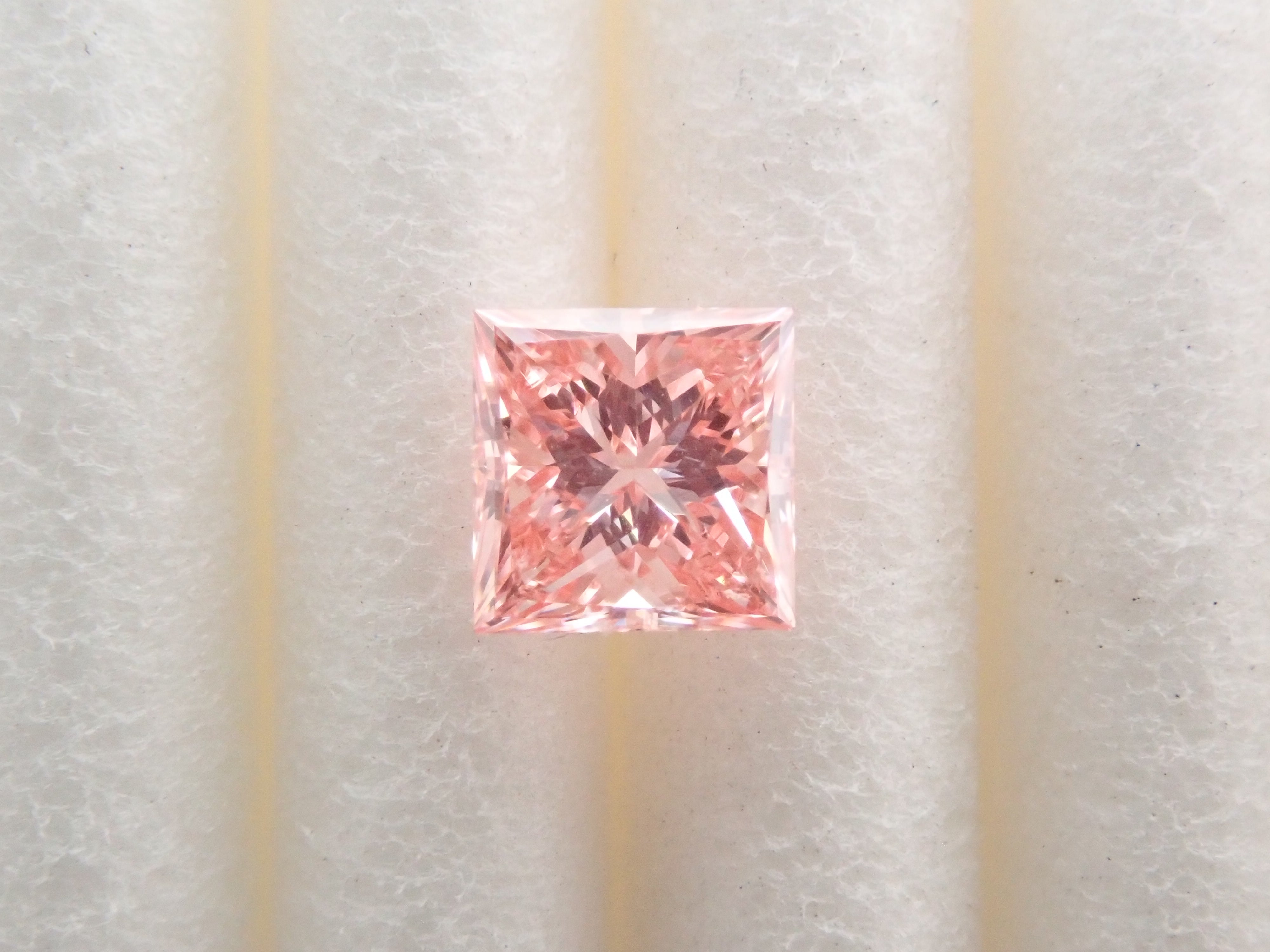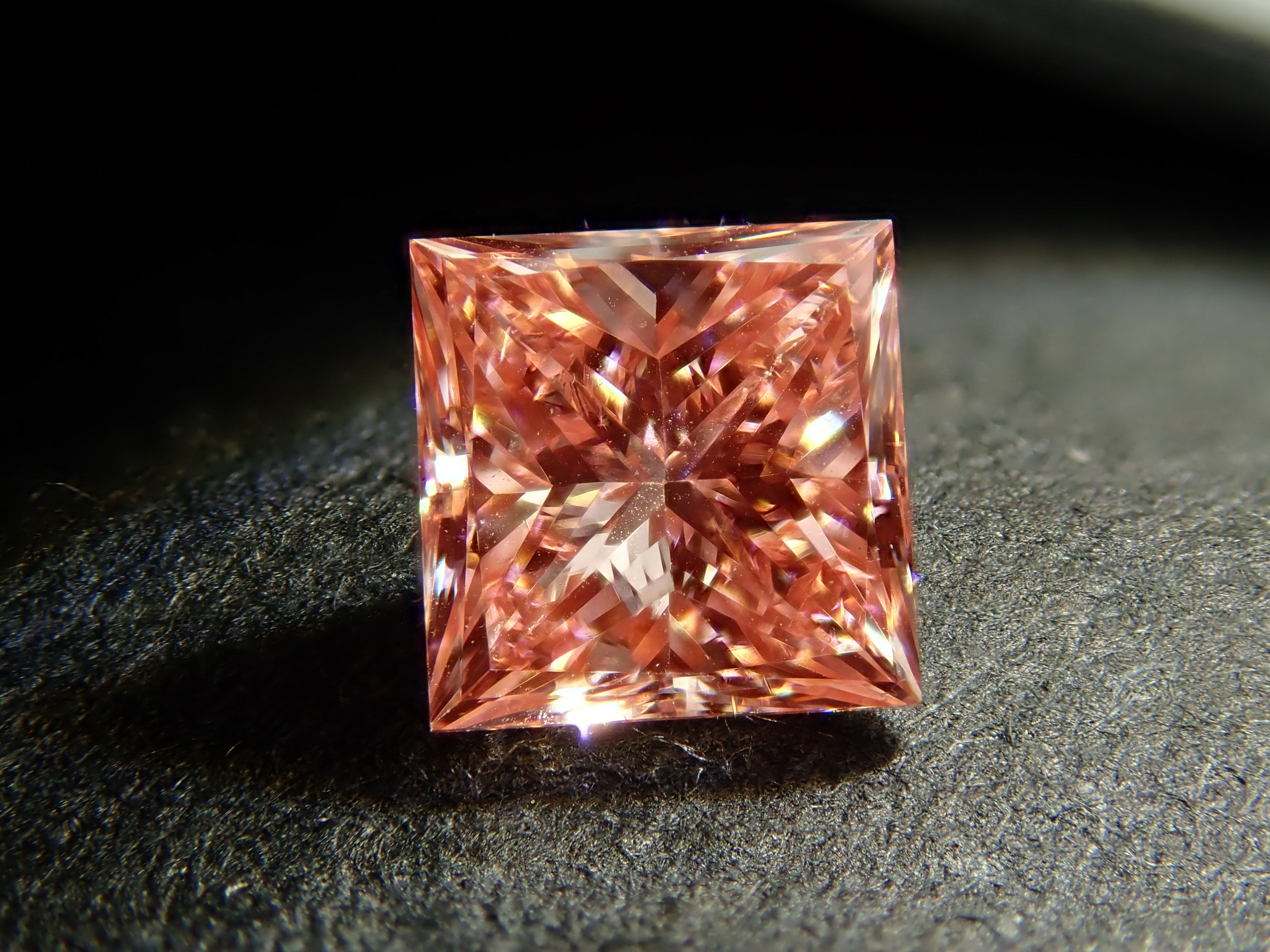 這是一顆公主方形切割的實驗室合成鑽石。顏色是絢麗鮮豔的粉紅色。