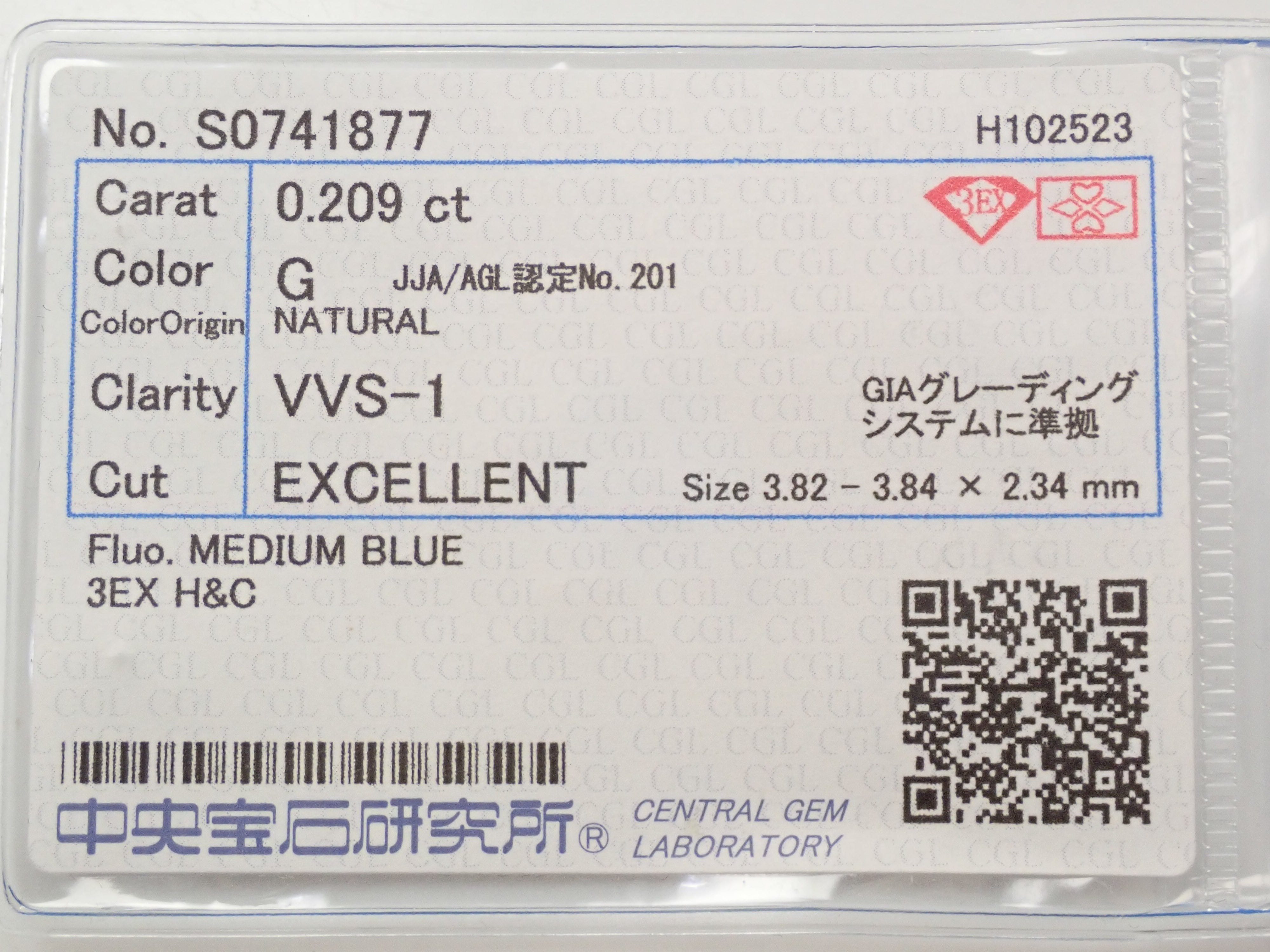 鑽石 3.8 毫米/0.209 裸鑽(G、VVS1、3Excellent H&C)。經過中央寶石實驗室的分類。
