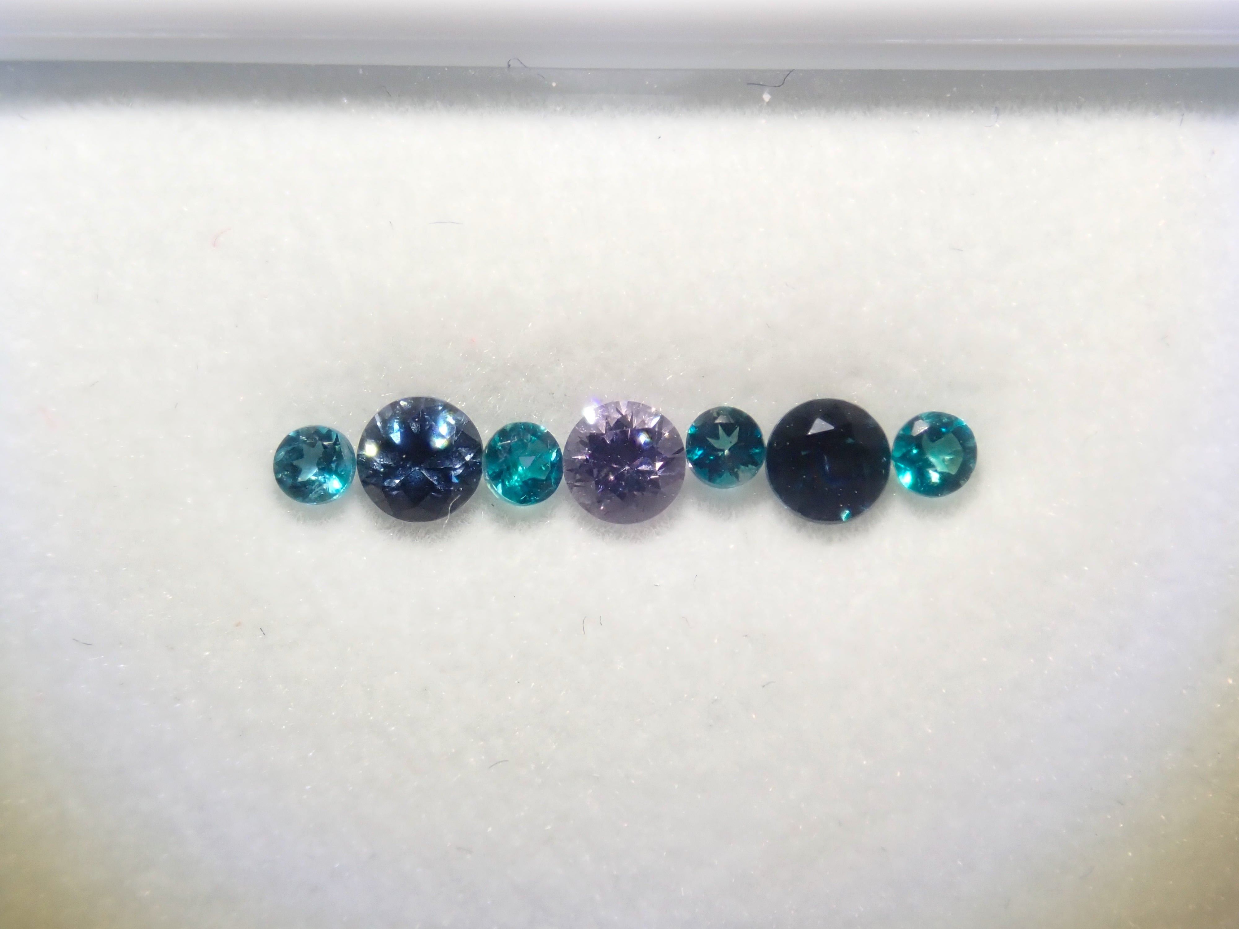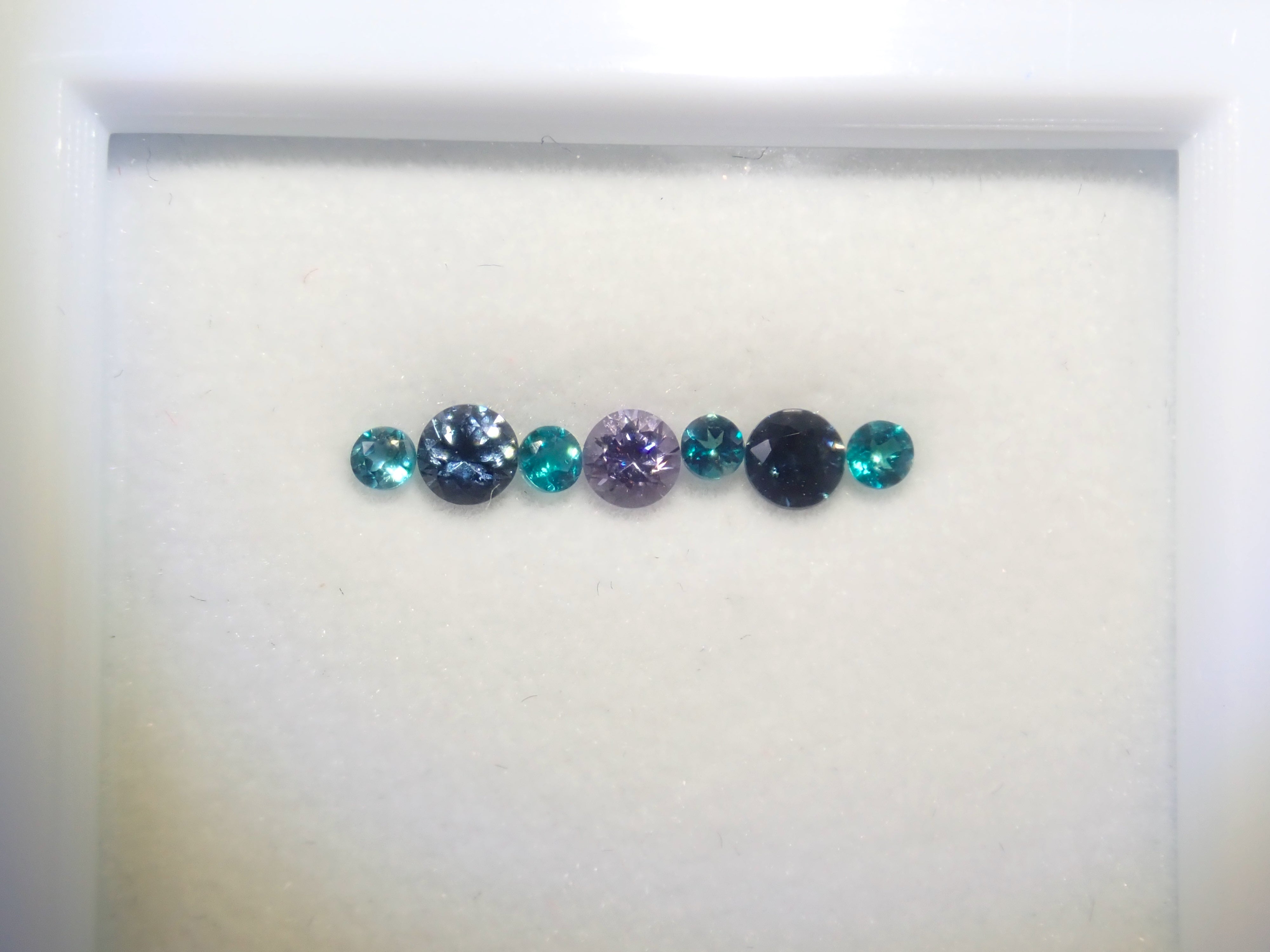 ・3 塊來自斯里蘭卡的尖晶石,3 毫米 ・4 塊來自馬達加斯加的矽鎂石,2 毫米