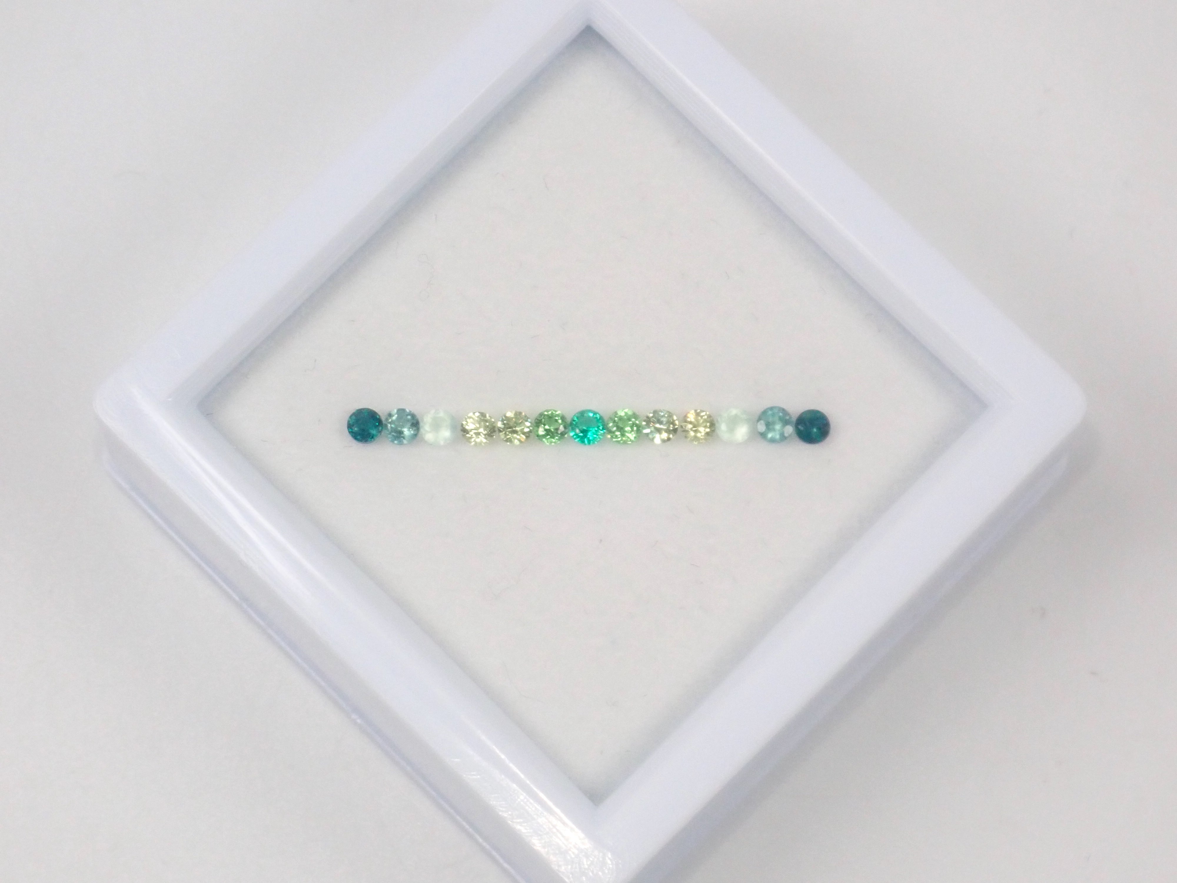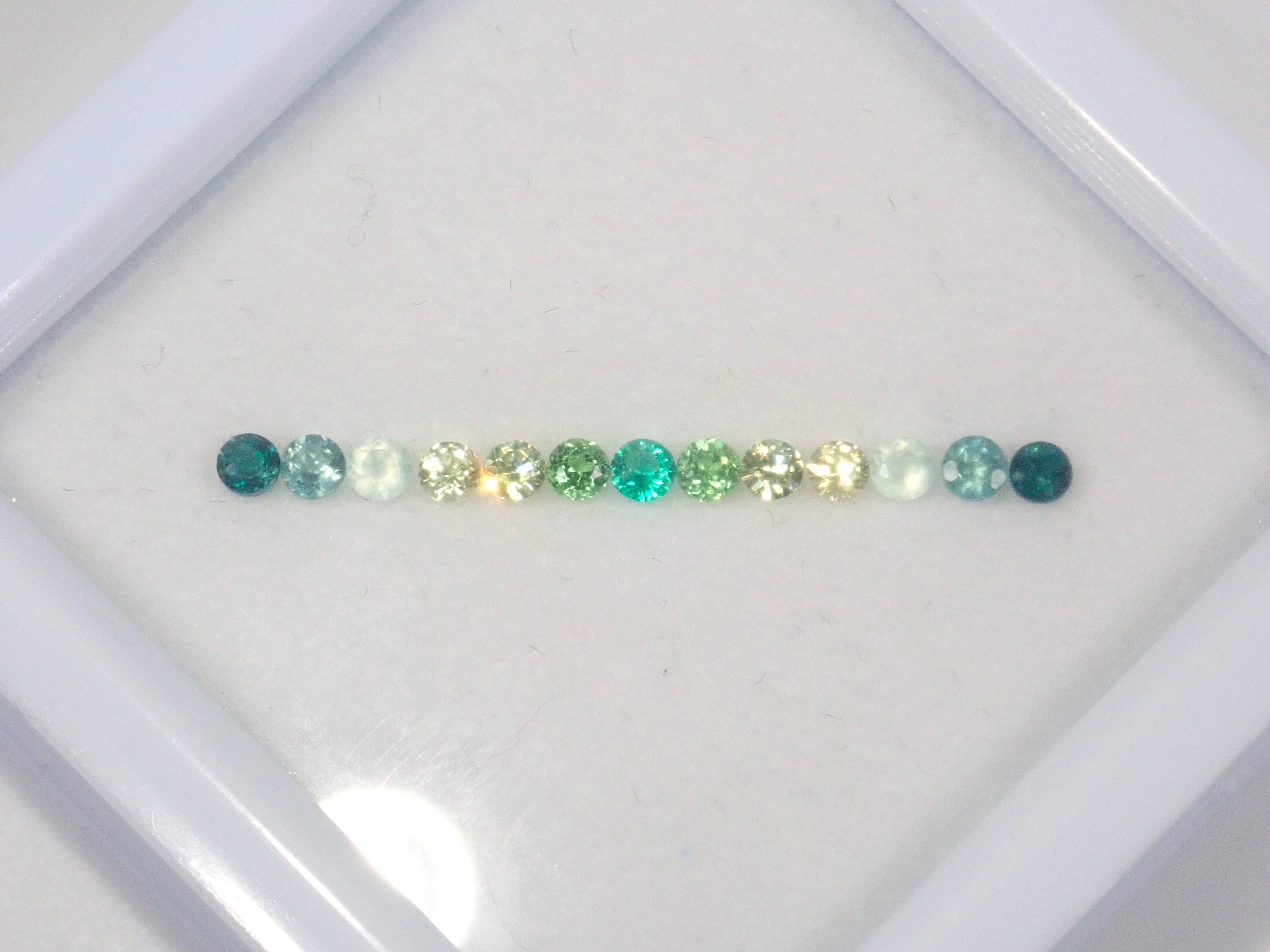 1 顆祖母綠、2 顆綠色石榴石、2 顆翠榴石、2 顆橄欖石、2 顆綠玉髓、2 顆綠色磷灰石、2 顆矽灰石