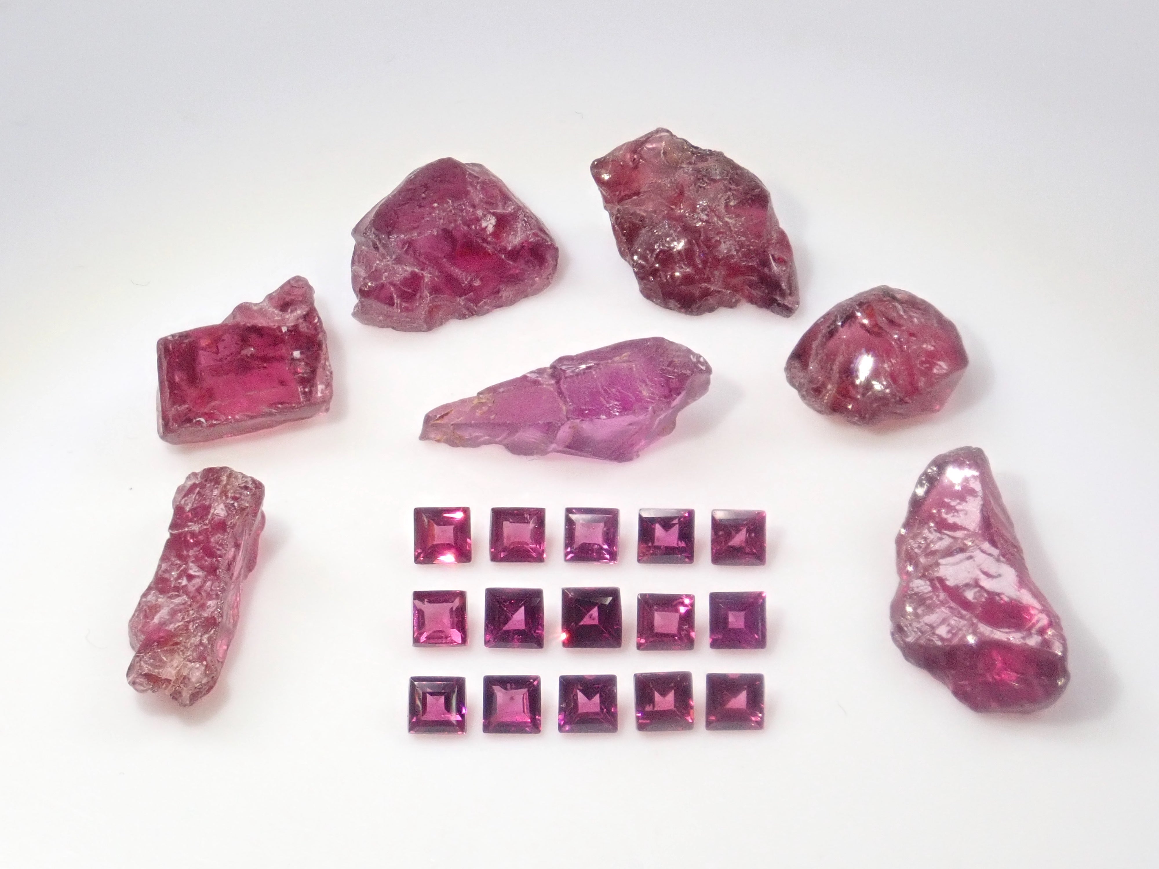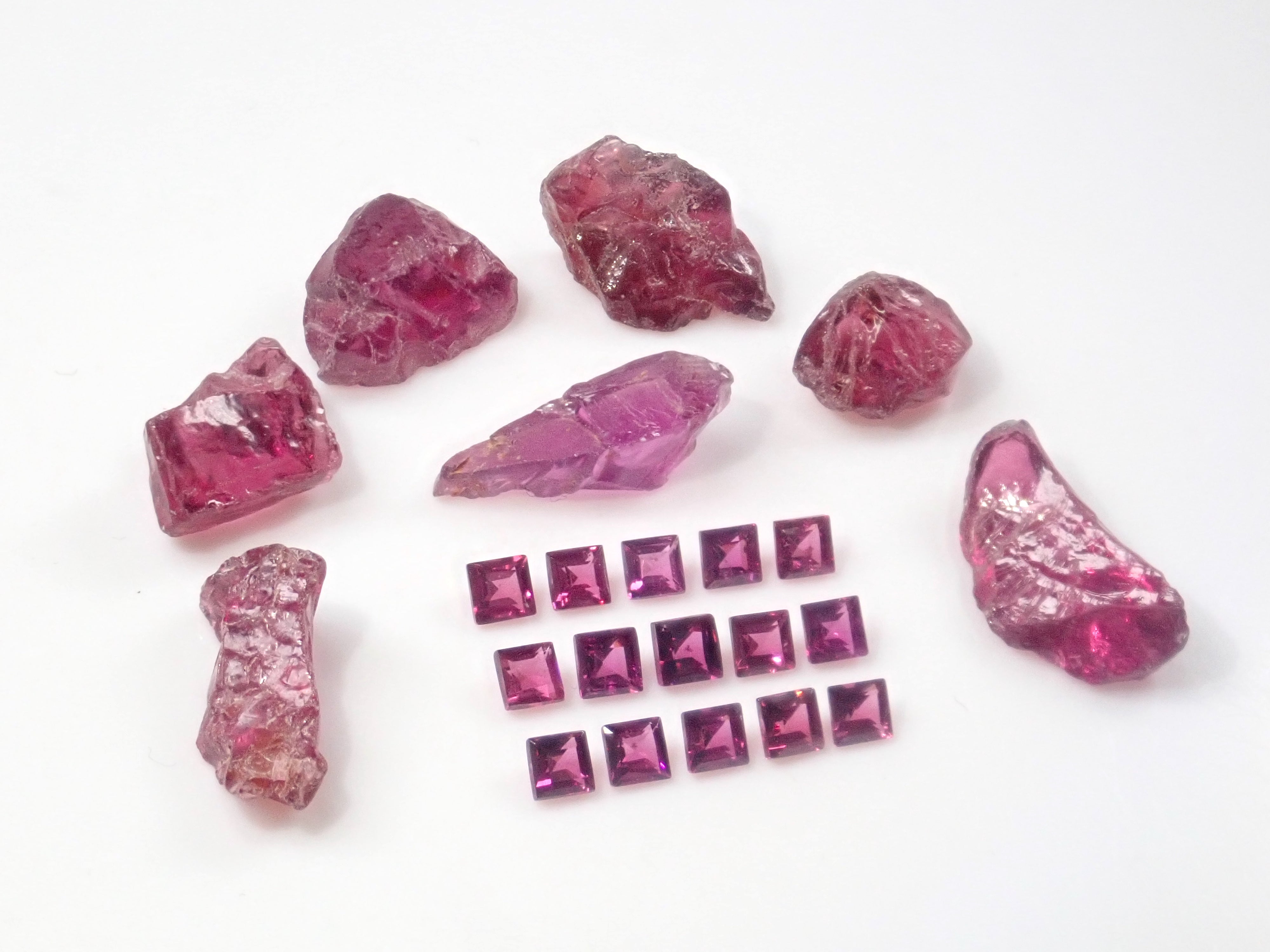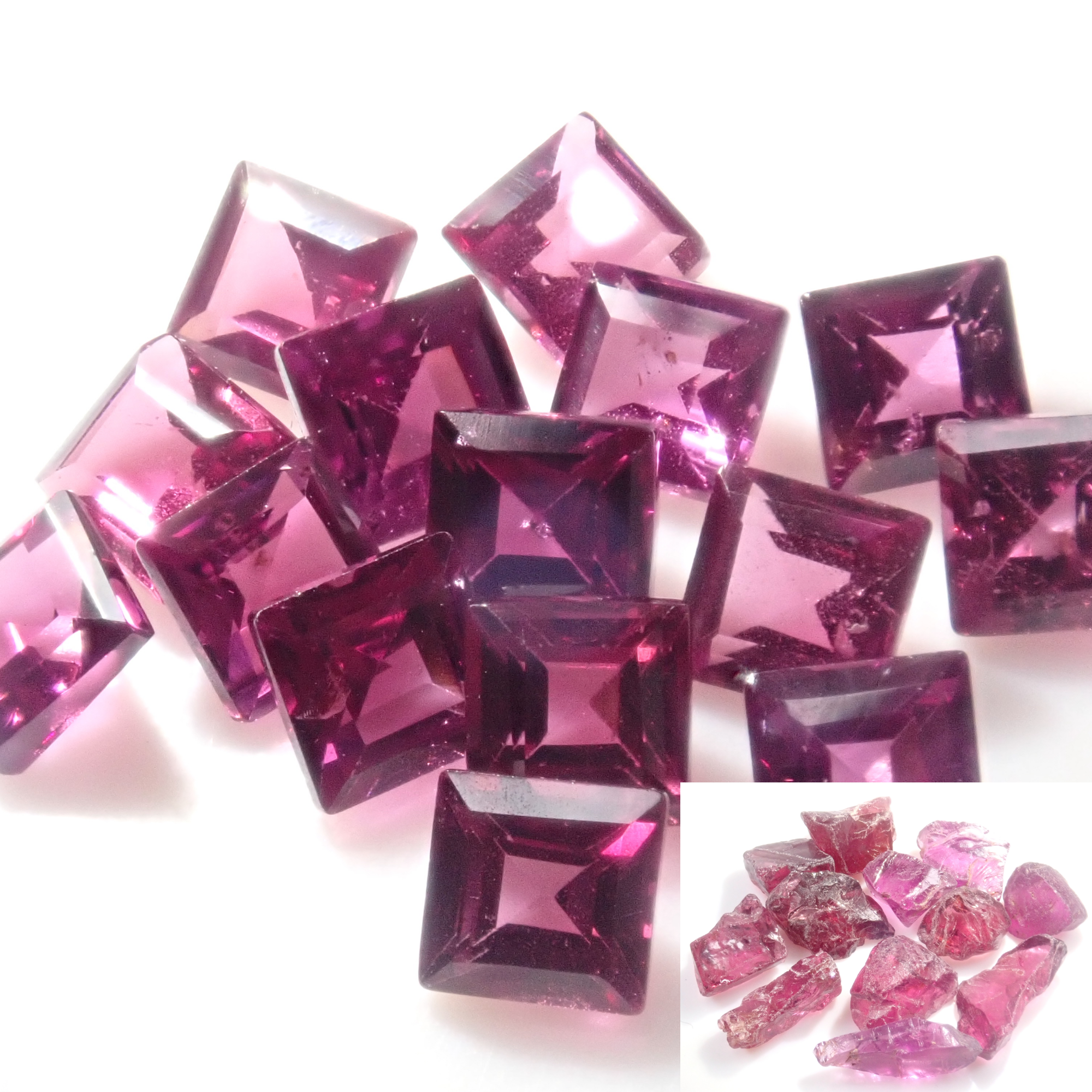 這是一組 2 顆寶石,由方形切割紅榴石石榴石和原石組成。尺寸為2.5毫米。紅榴石石榴石原石透明,顏色深。原石尺寸約 2.5 克拉。