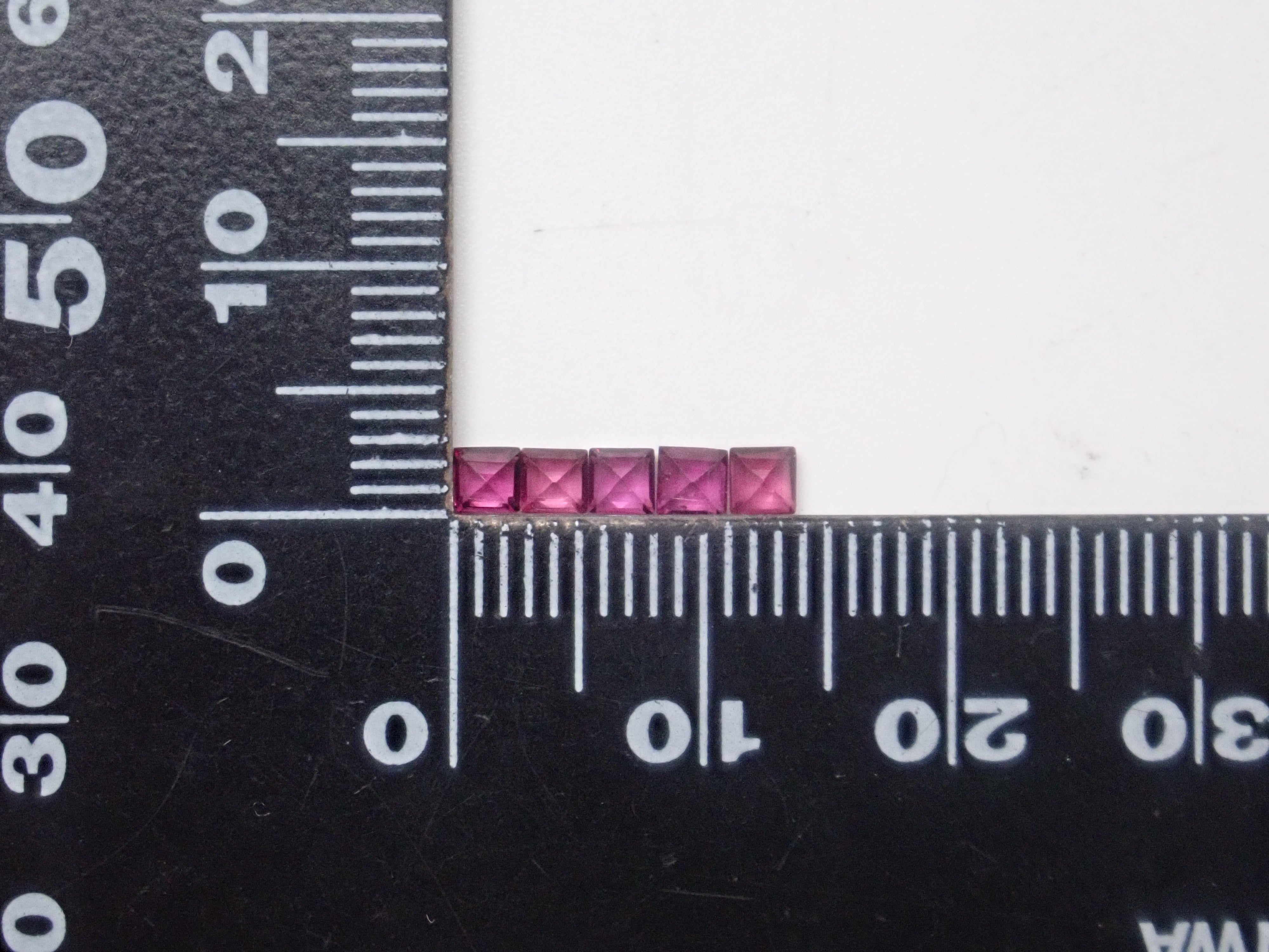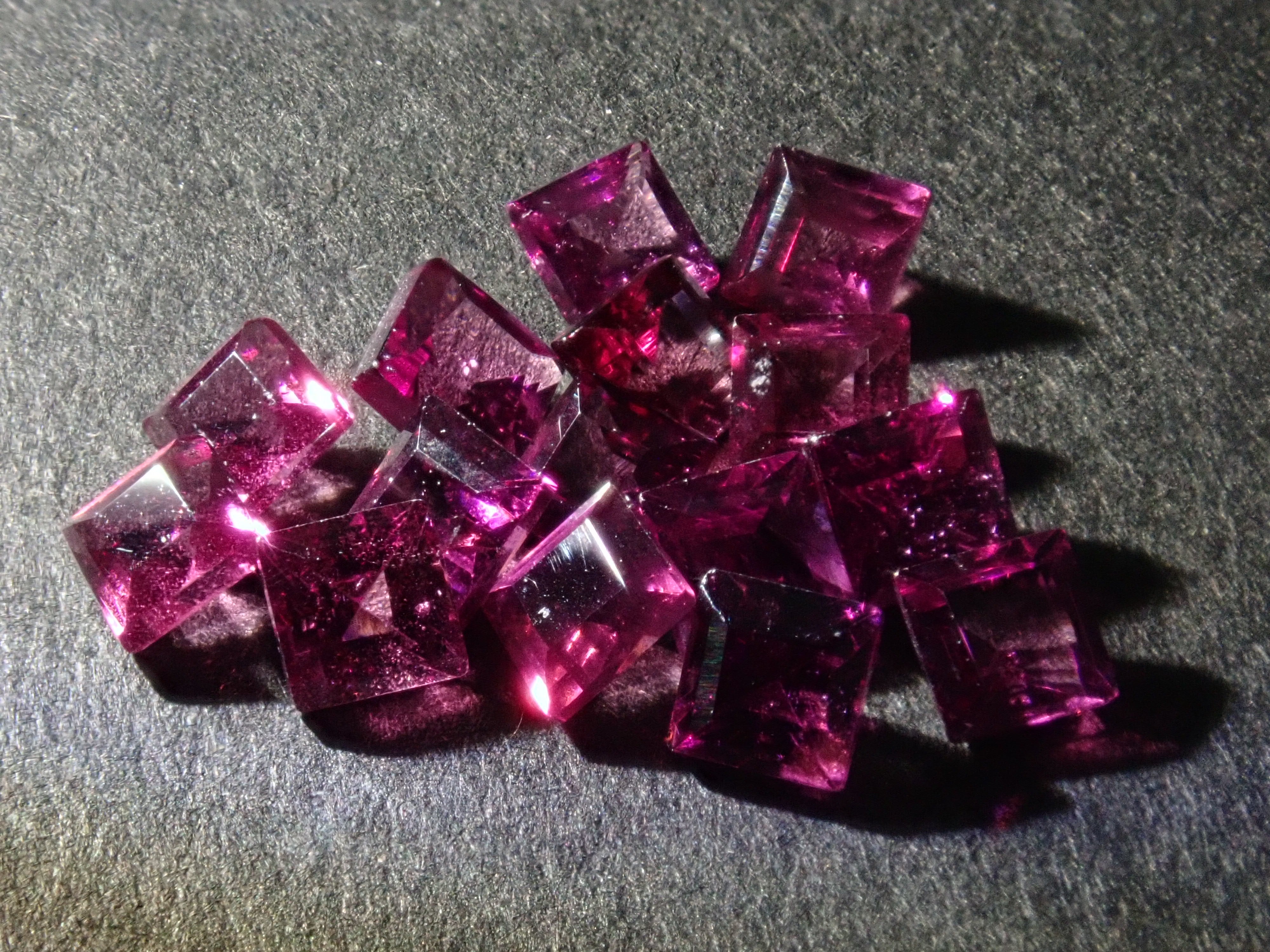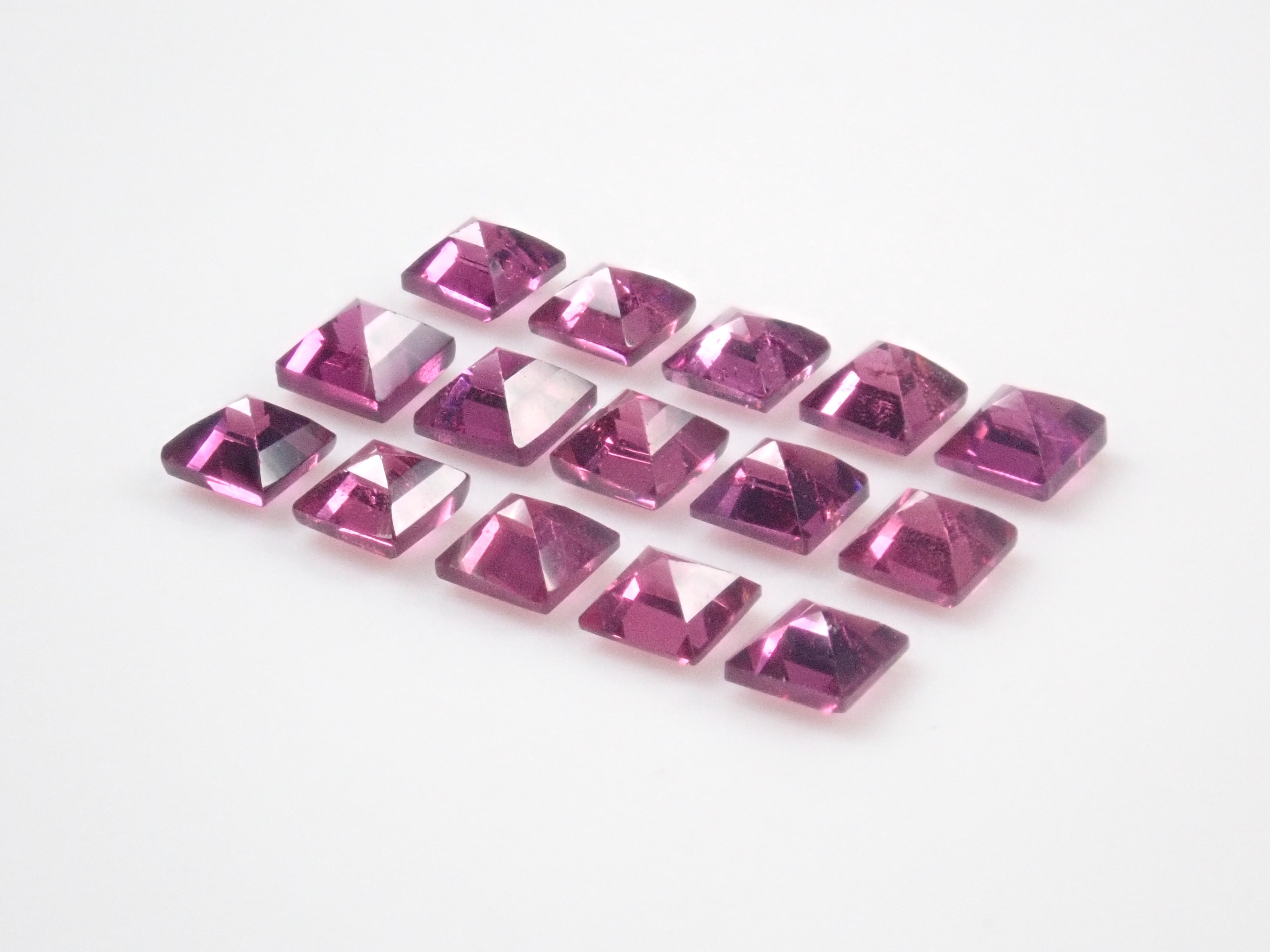 這是一組 2 顆寶石,由方形切割紅榴石石榴石和原石組成。尺寸為2.5毫米。紅榴石石榴石原石透明,顏色深。原石尺寸約 2.5 克拉。