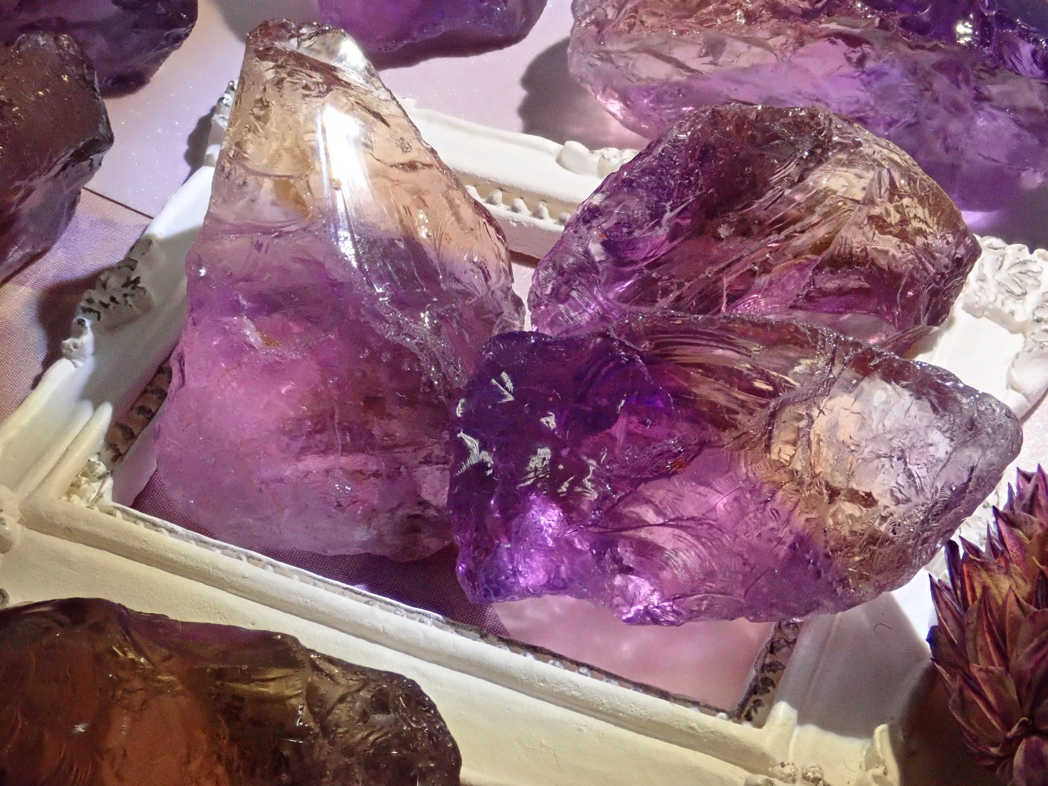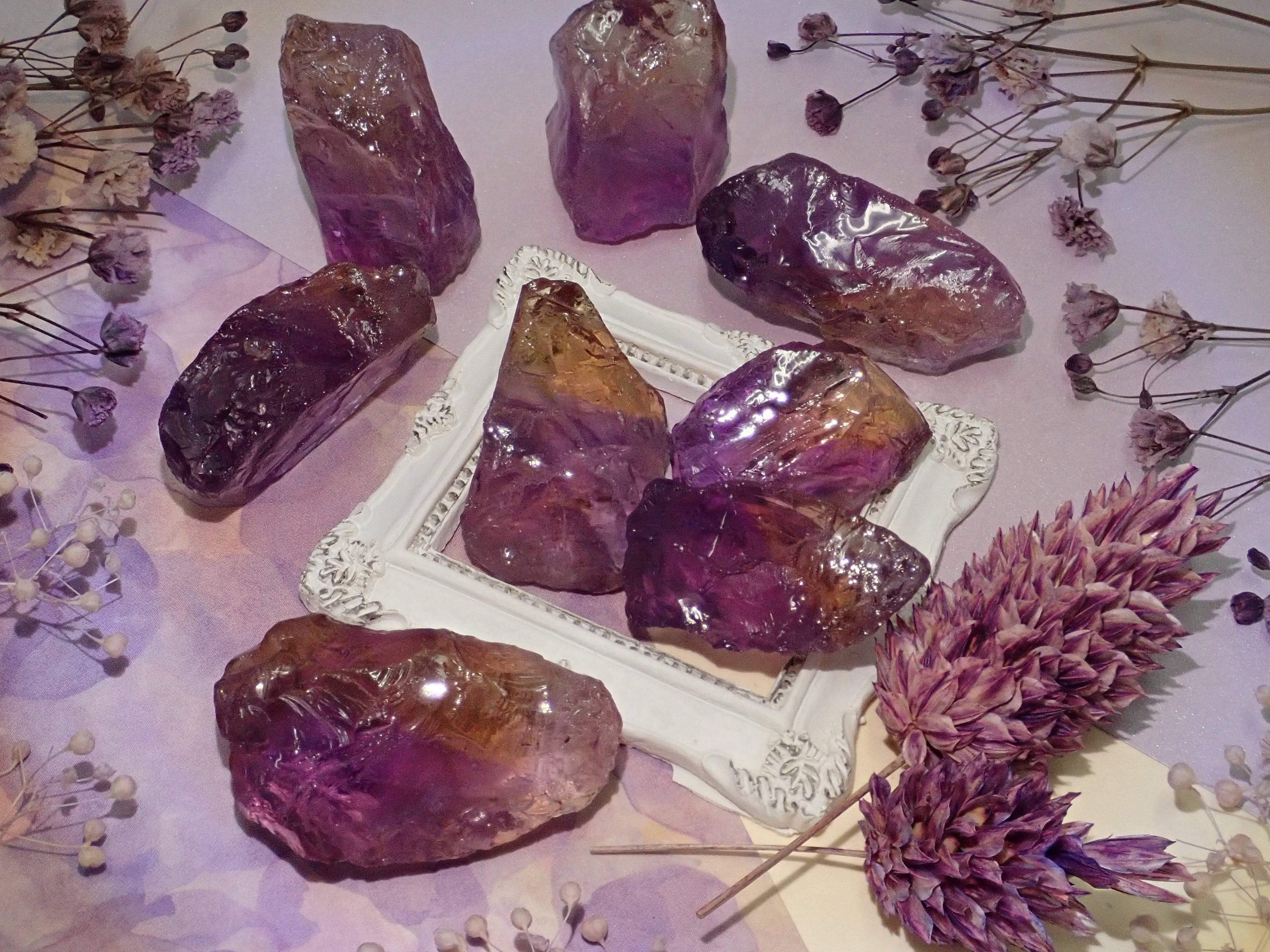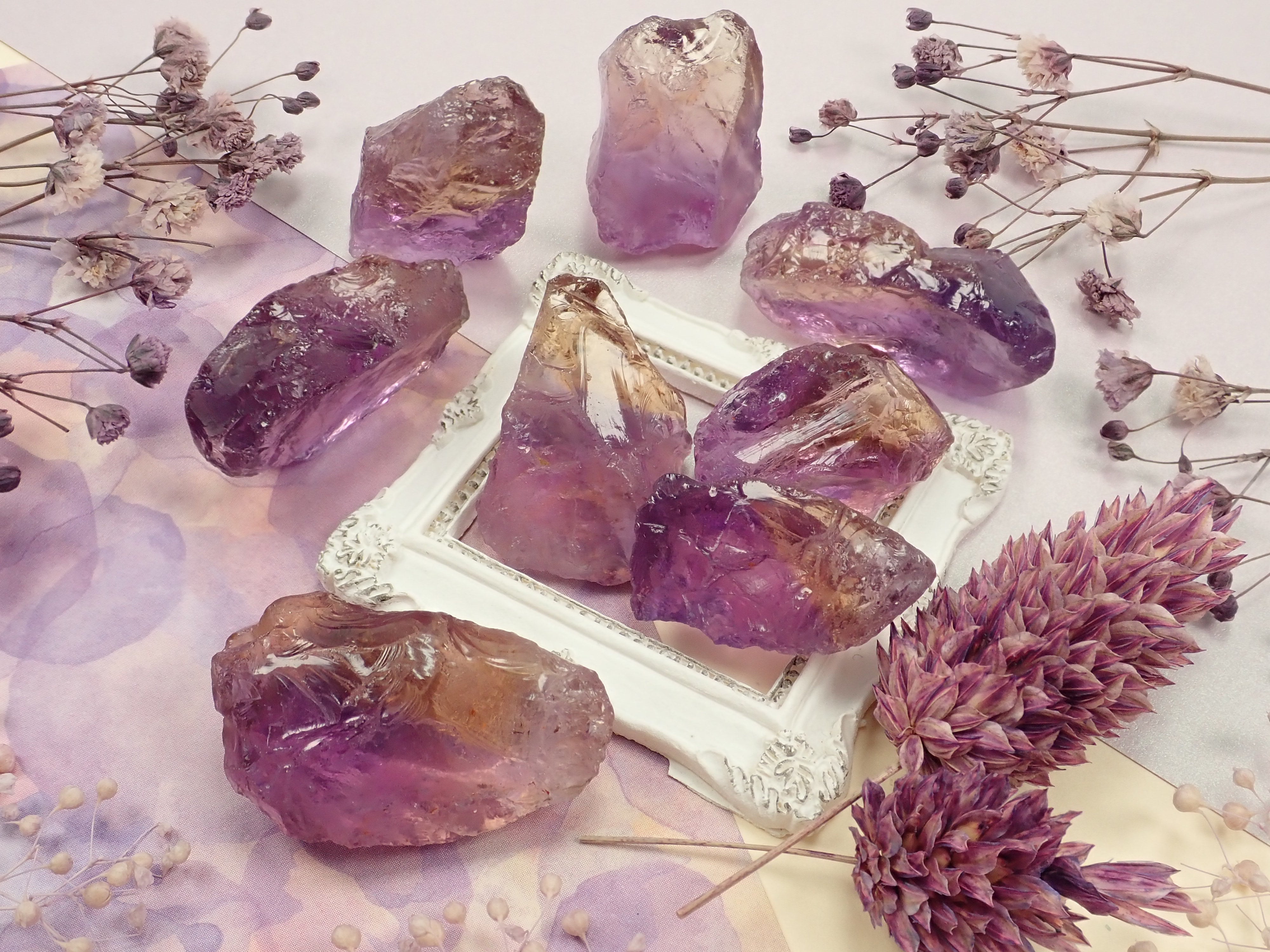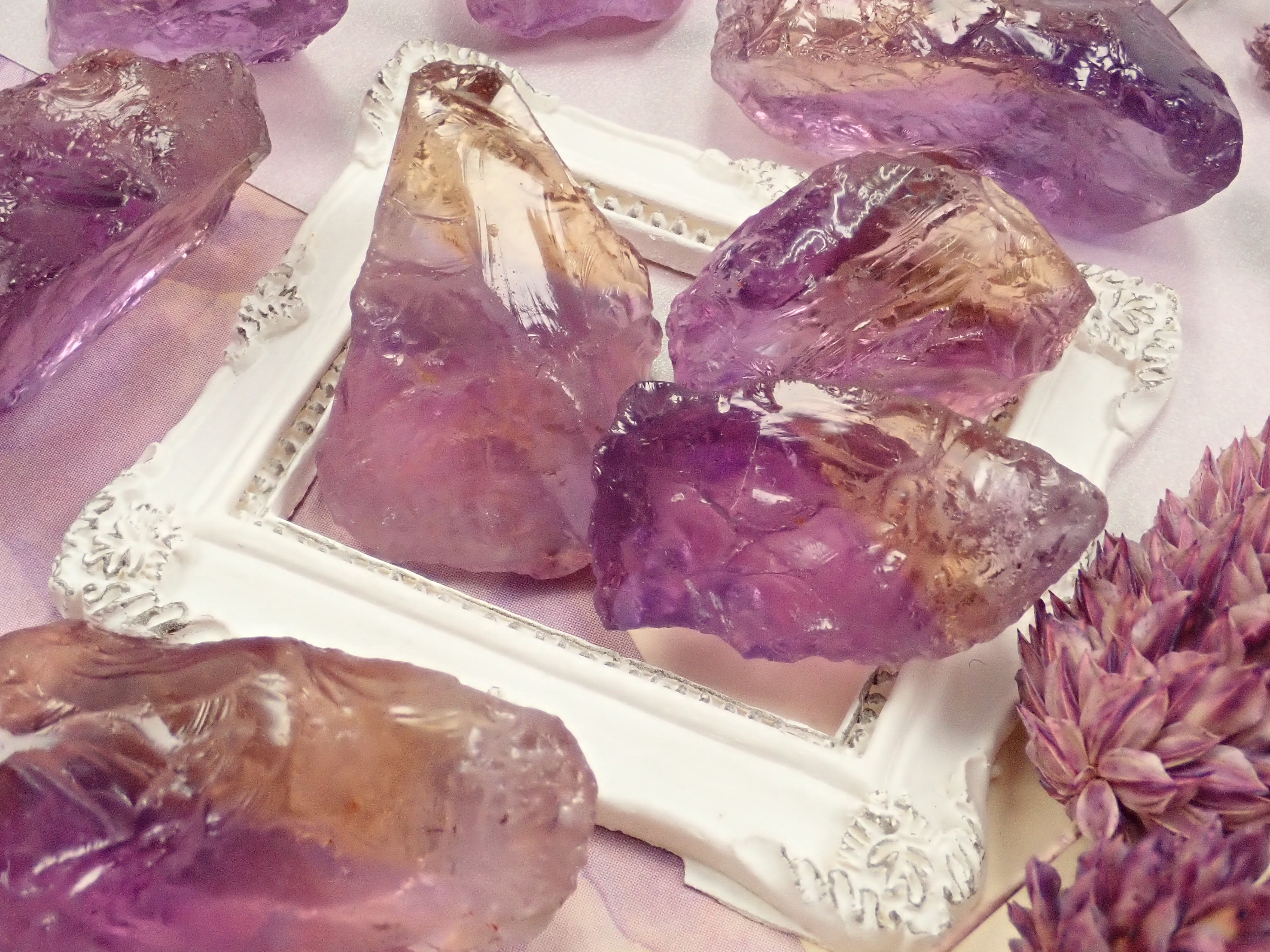 紫黃晶可以讓您同時享受紫水晶的紫色和黃水晶的黃色。紫水晶和黃水晶都是石英(水晶)的一種,它們的寶石名稱是“雙色石英”,日本名稱是紫水晶。