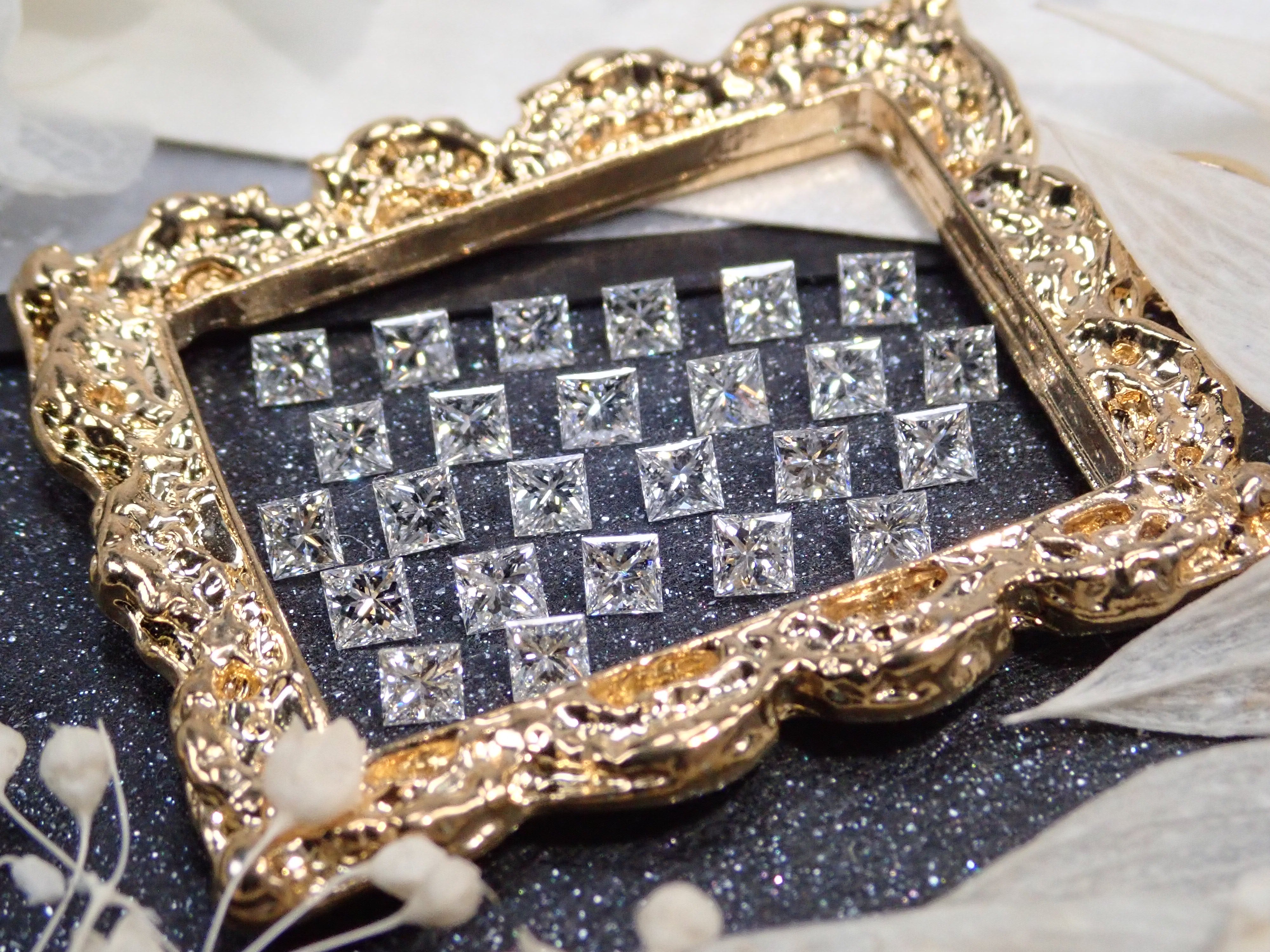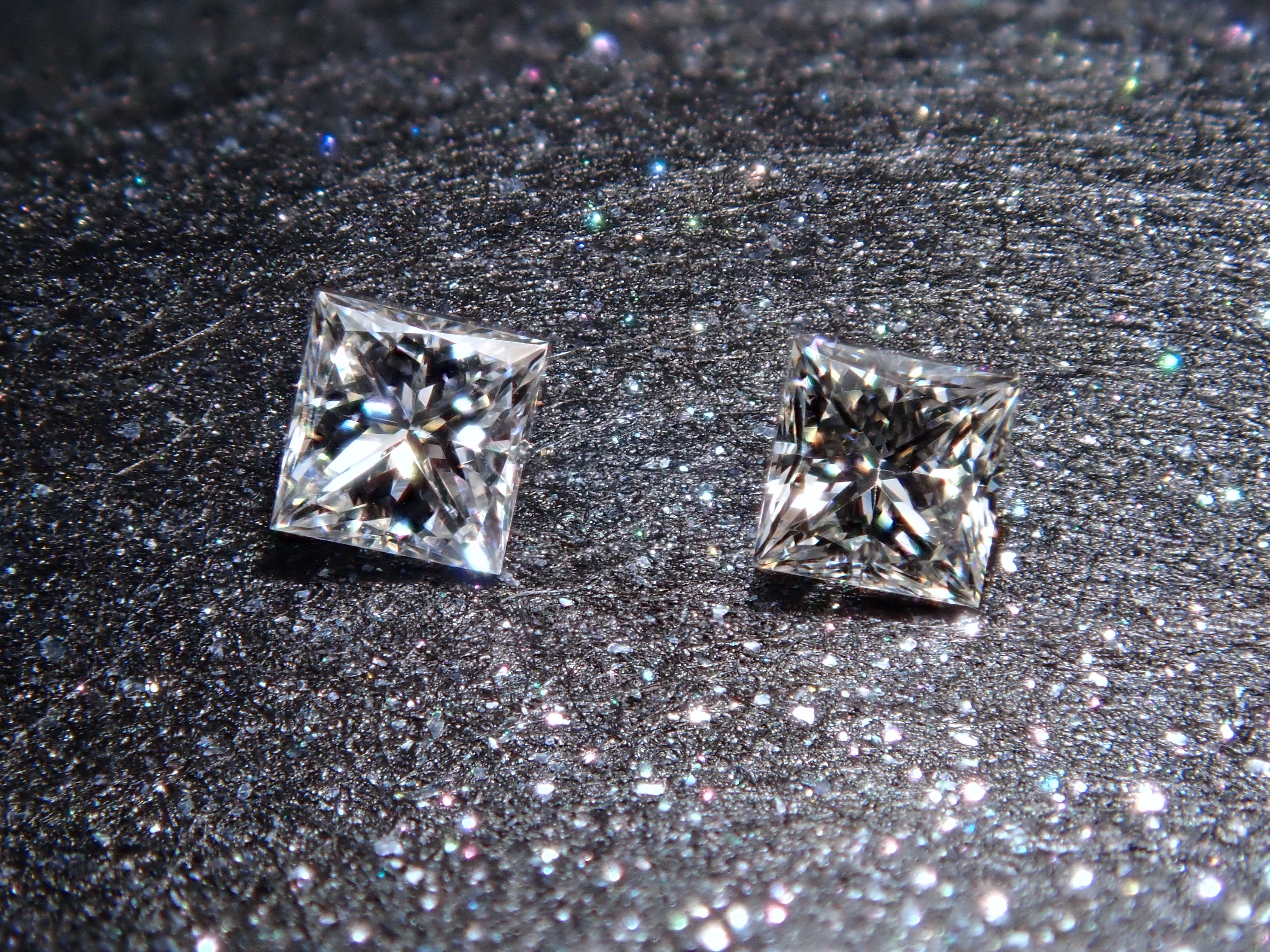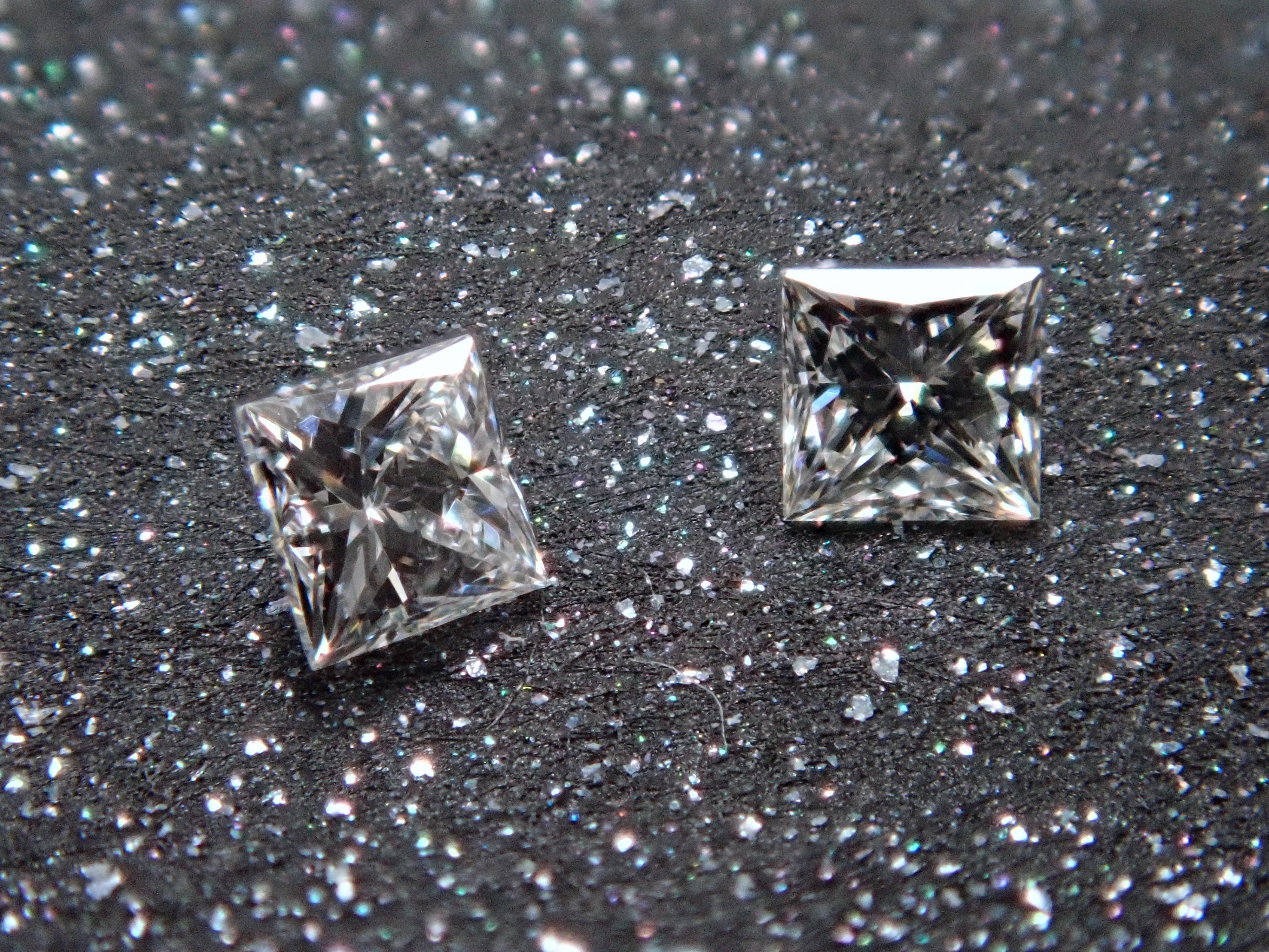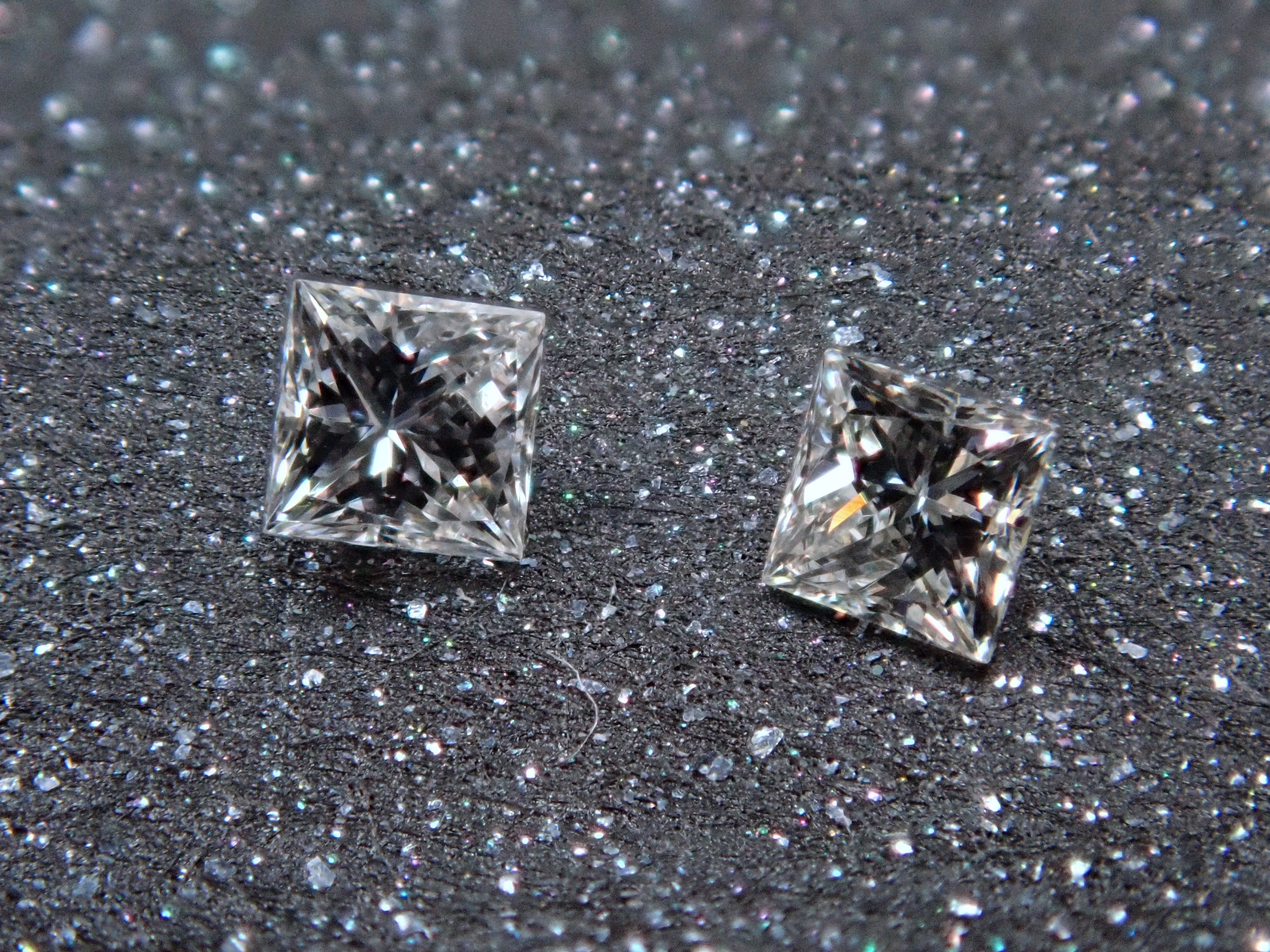 公主方形切割鑽石。尺寸為2.0毫米,淨度相當於VS級(即使用放大鏡觀察也很難發現內含物的鑽石),顏色為無色,相當於D級至G級。