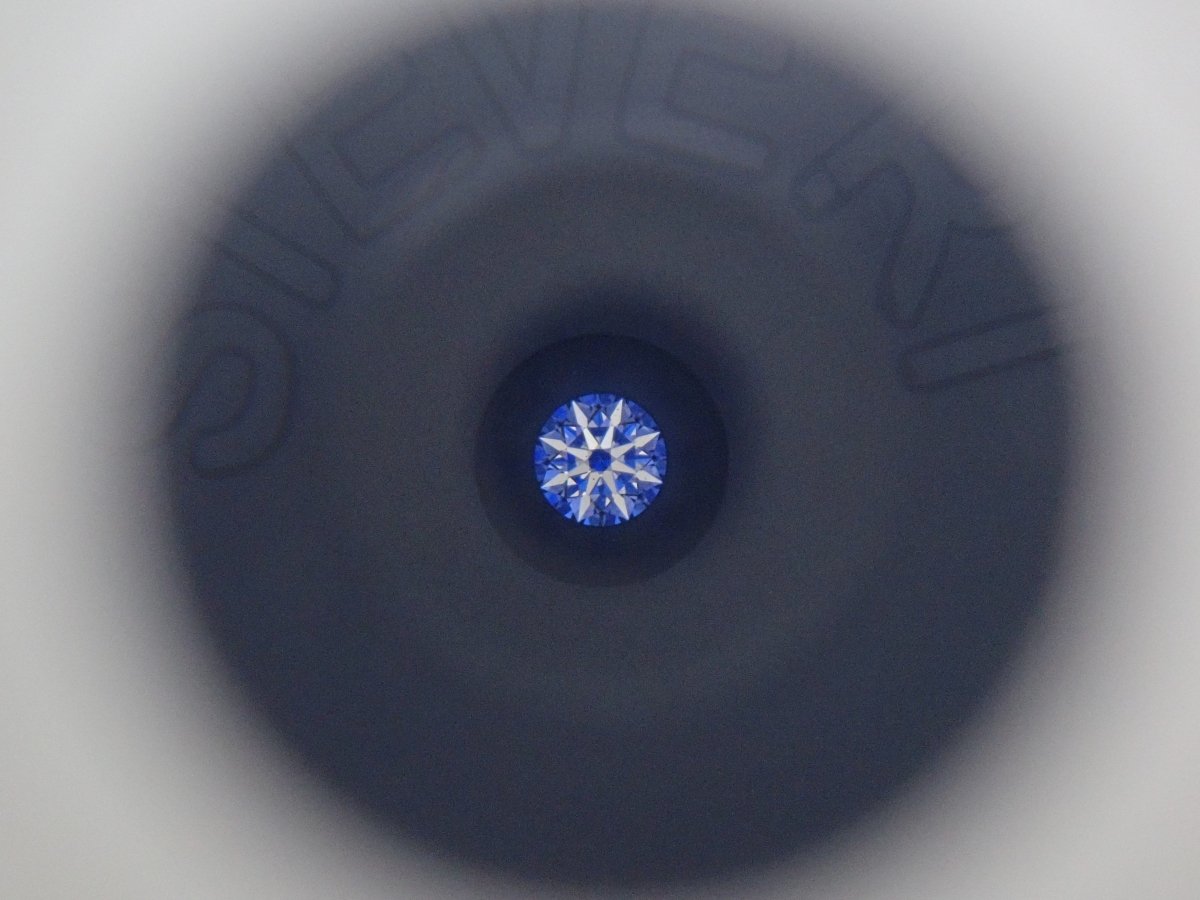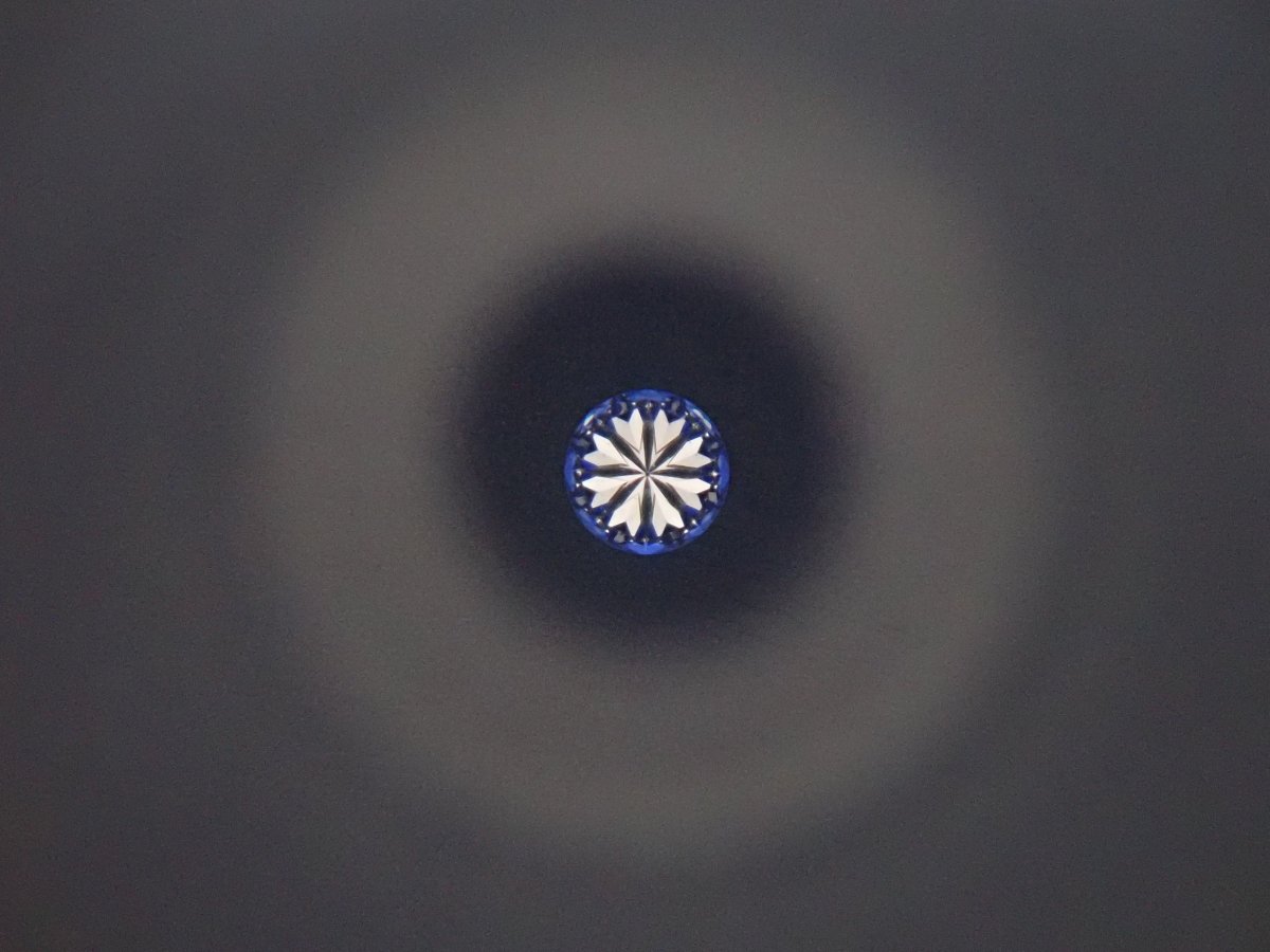 將鑽石放入瞄準鏡附帶的特製石座的孔中,使桌面(平坦的一面)朝上。如果您用瞄準鏡從上方觀察鑽石,您會看到箭頭圖案(類似於弓的圖案)。請將鏡體的半透明部分放在您的眼睛上。