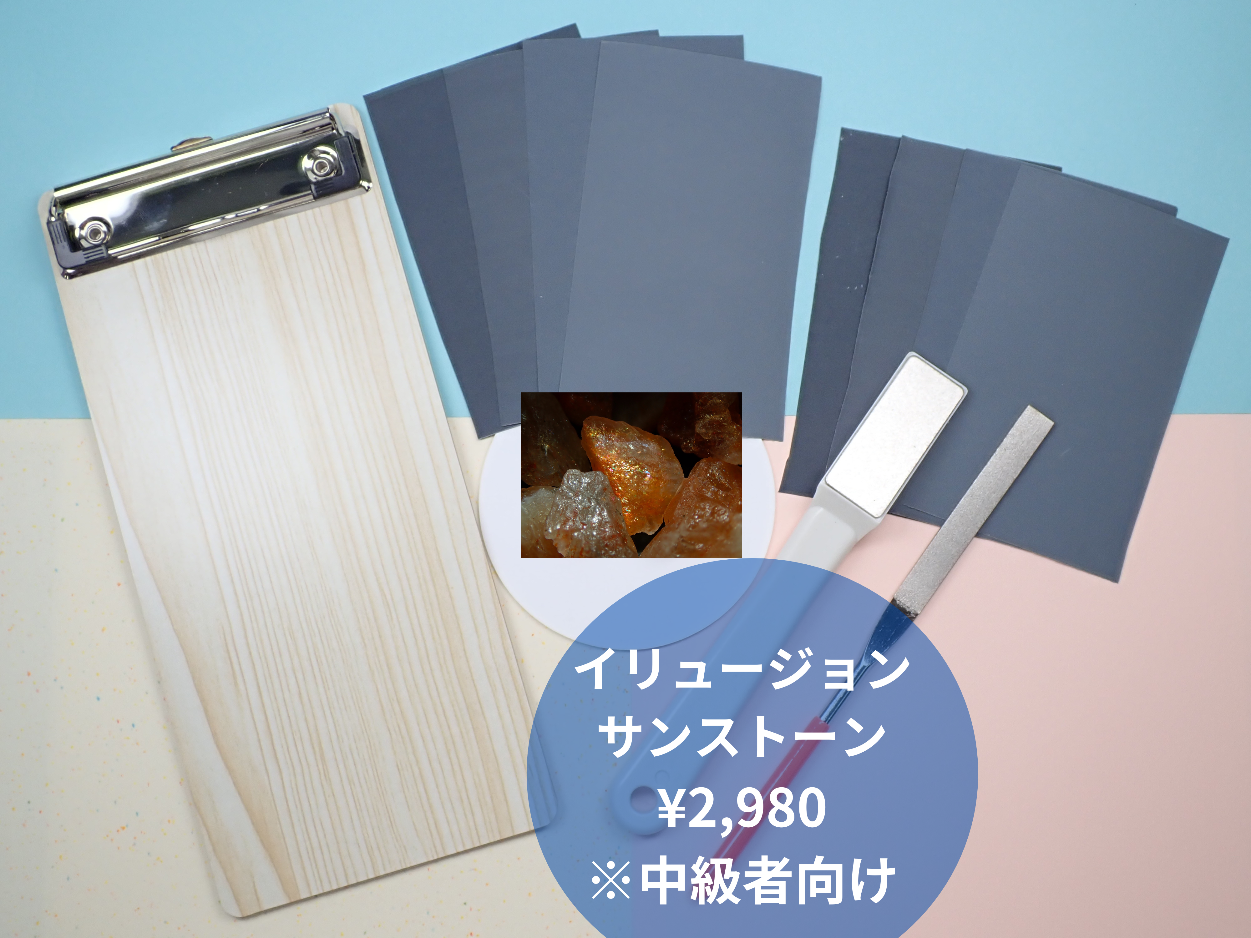 套裝包括用於拋光原石的工具和一顆原石【幻影日光石】。有了這套套裝,您就可以在家中享受原石拋光體驗。在眾多幻彩的日光石中,我們精心挑選了那些具有特別美麗的砂光效果的日光石。