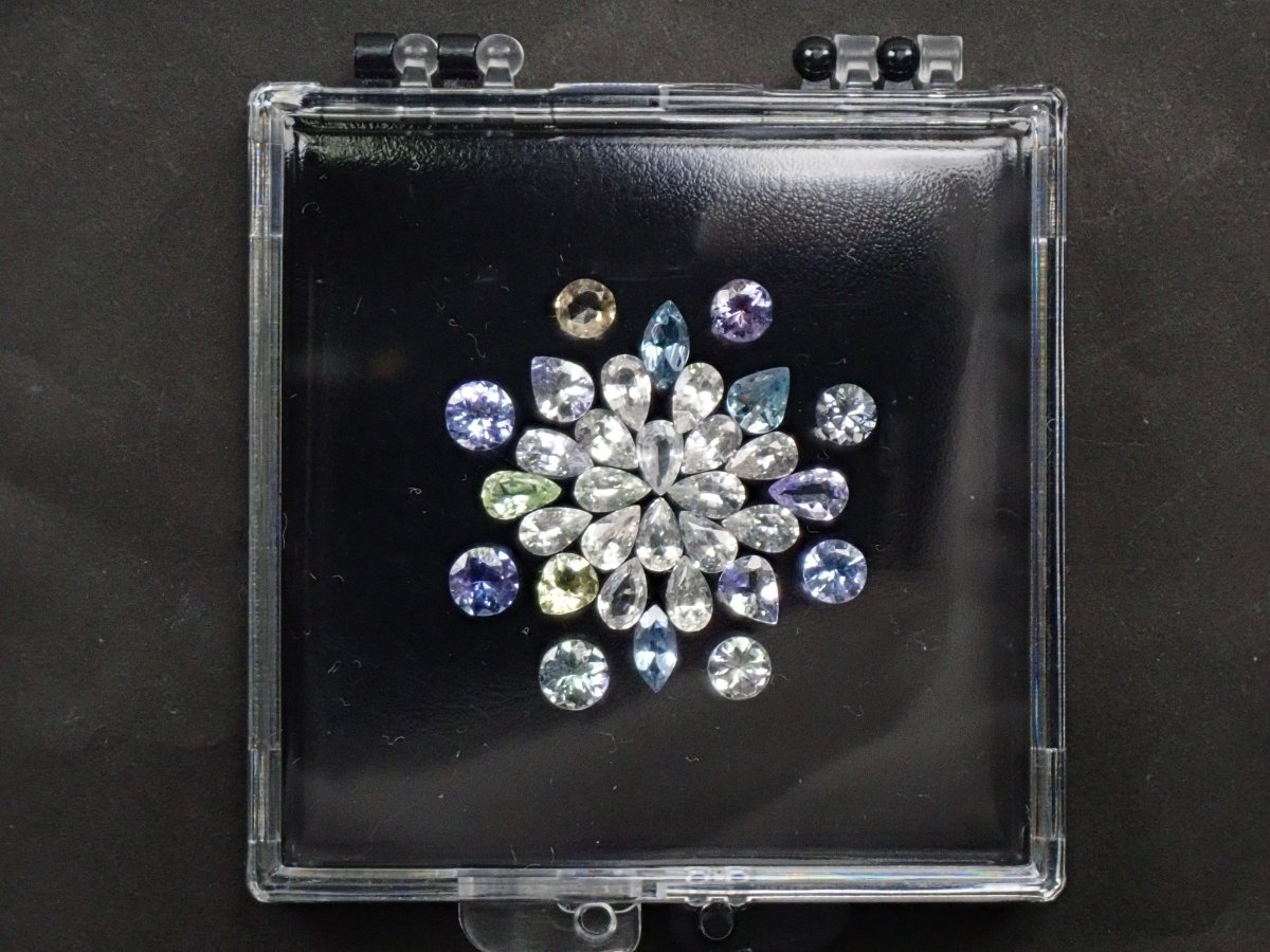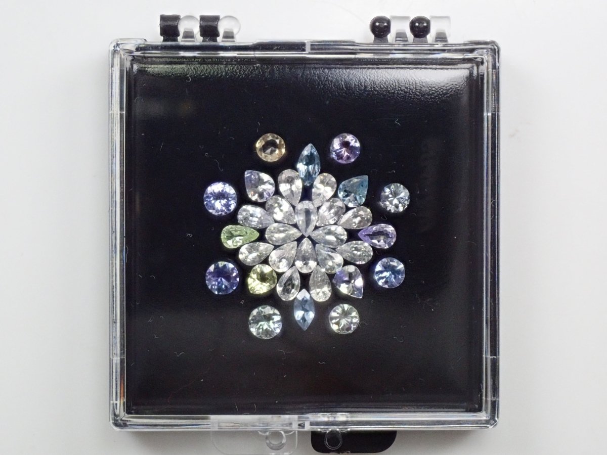 一個稱為凝膠釘盒的散裝盒和一組 3 顆藍寶石。