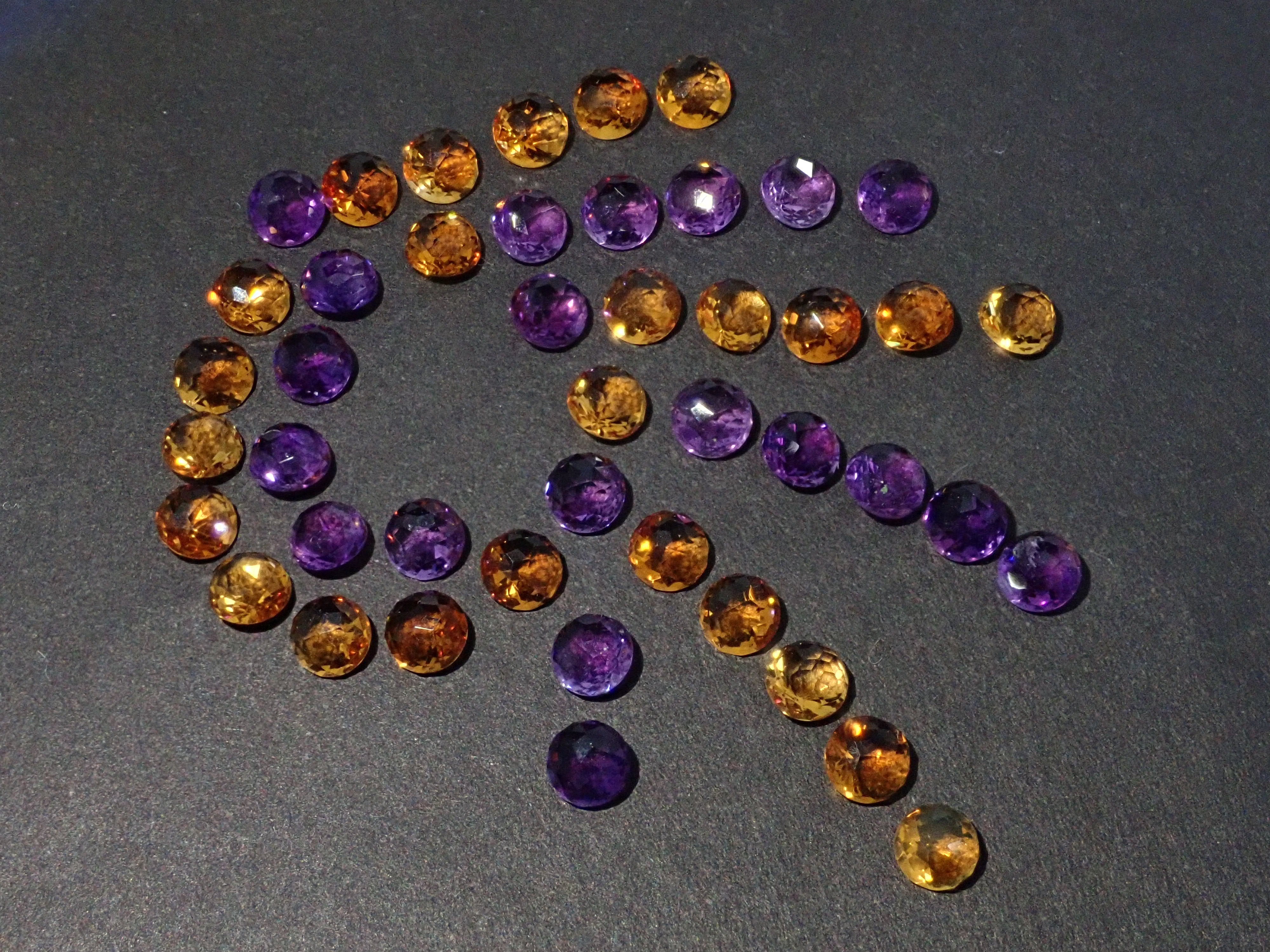 一組 2 顆寶石,由紫水晶和黃水晶組成,採用上子葉切工,看起來像是刻面切工和凸圓面切工的組合。曼谷高透明度和高品質的鬆切。