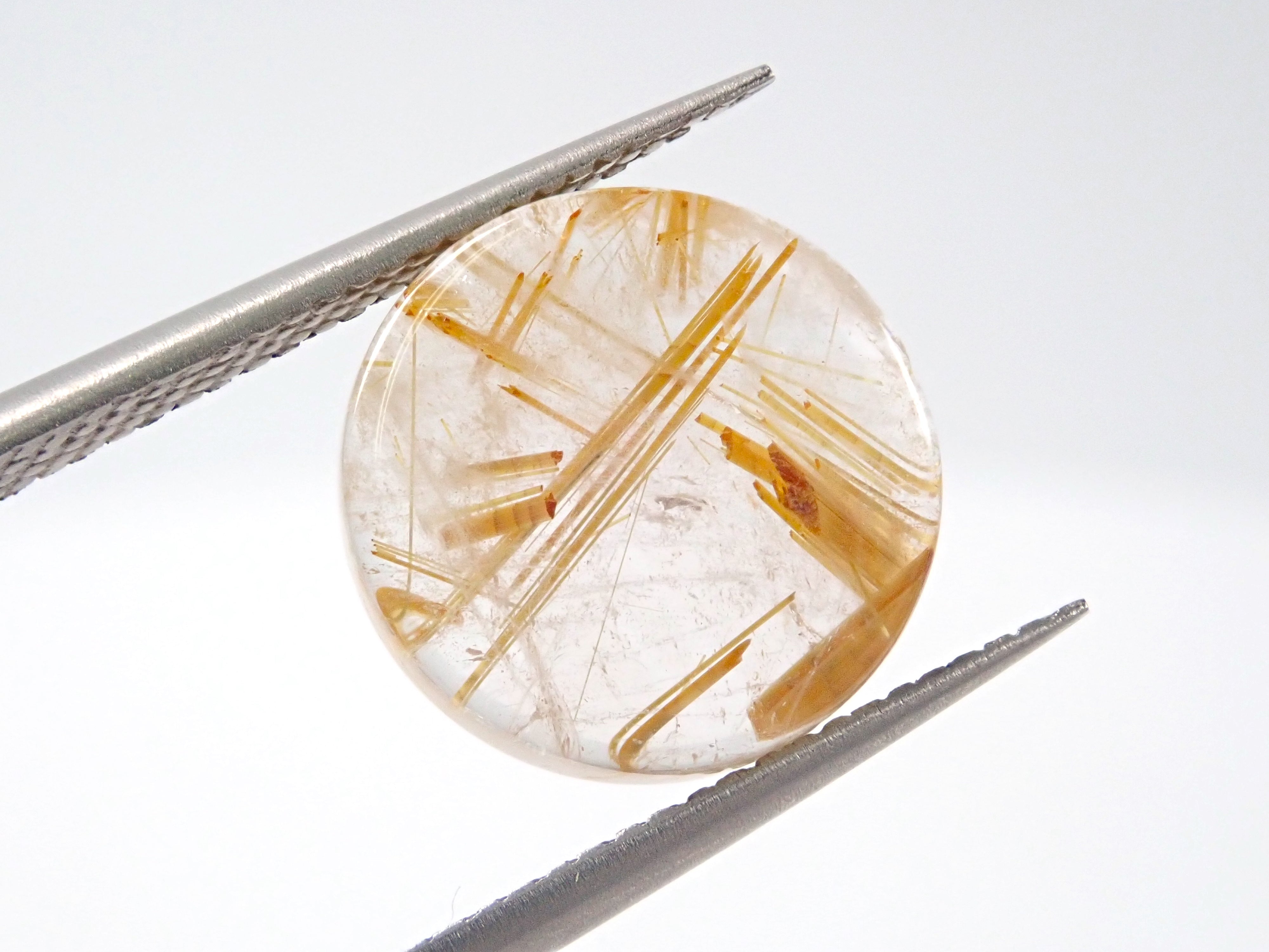 金紅石石英具有美麗的金色光澤。將一根由金紅石製成的「金針」插入晶體中。日本名字是“Kinkoishi”。又稱「金髮晶」、「發晶石」、「發晶石」等。這是12毫米的尺寸。