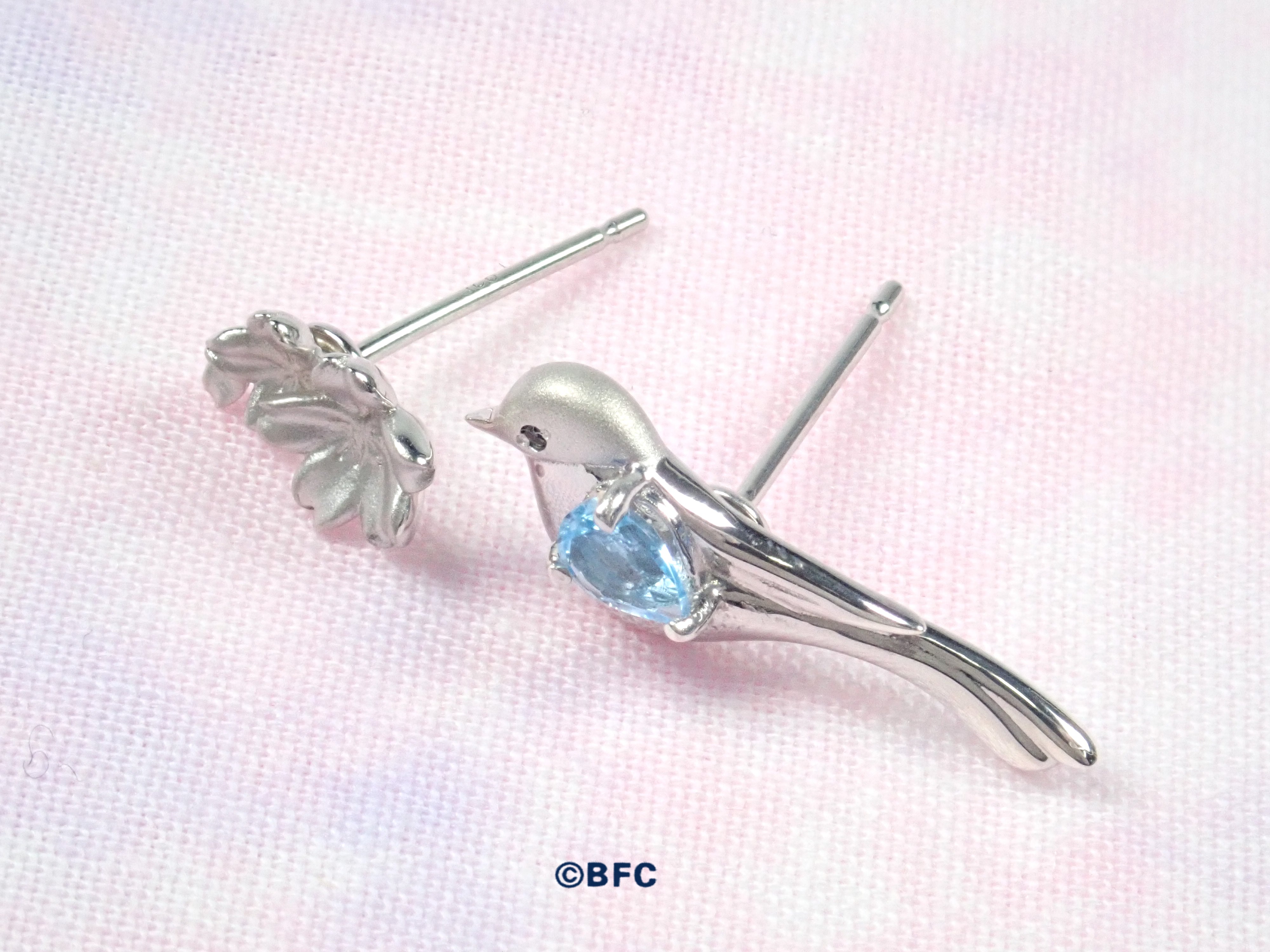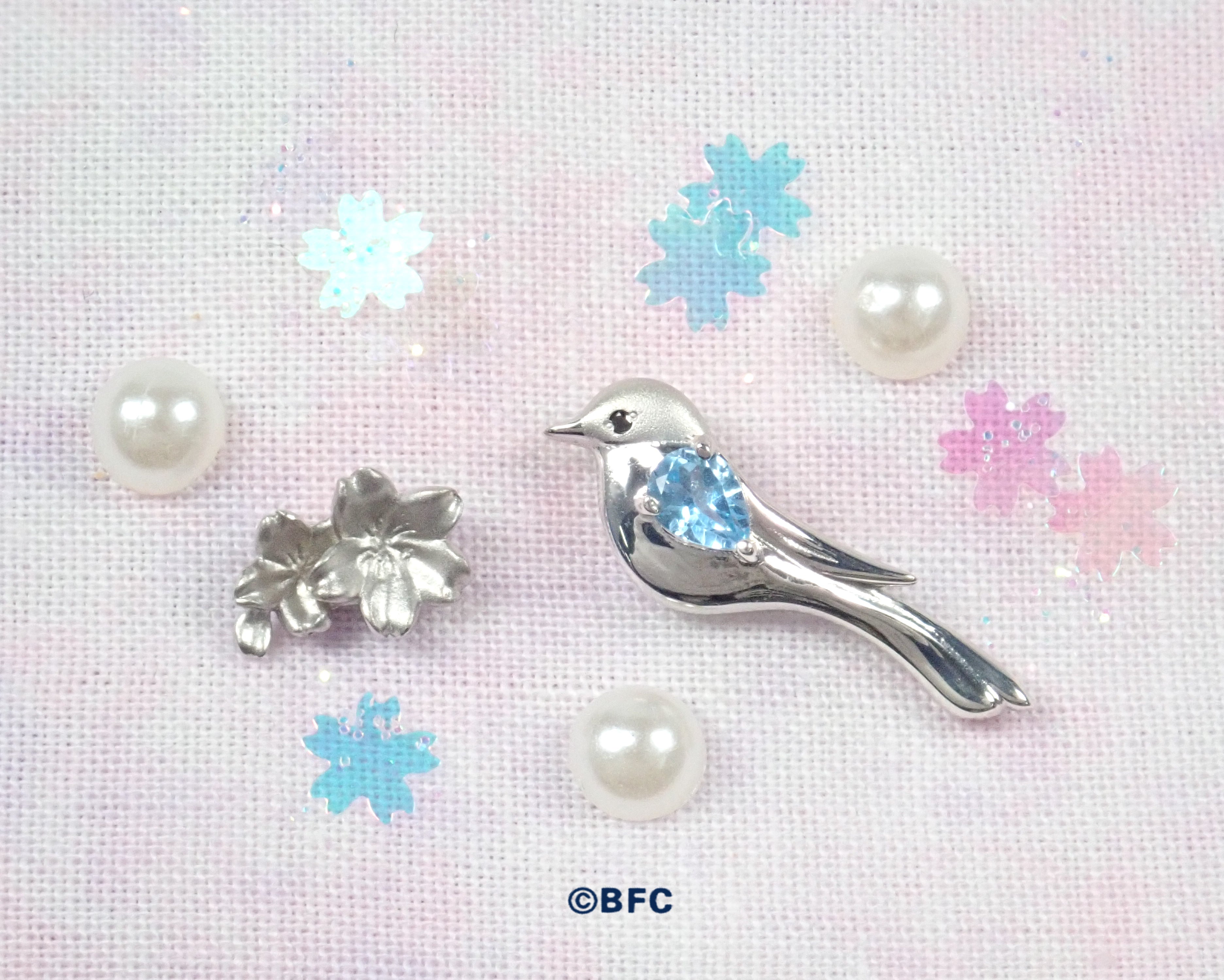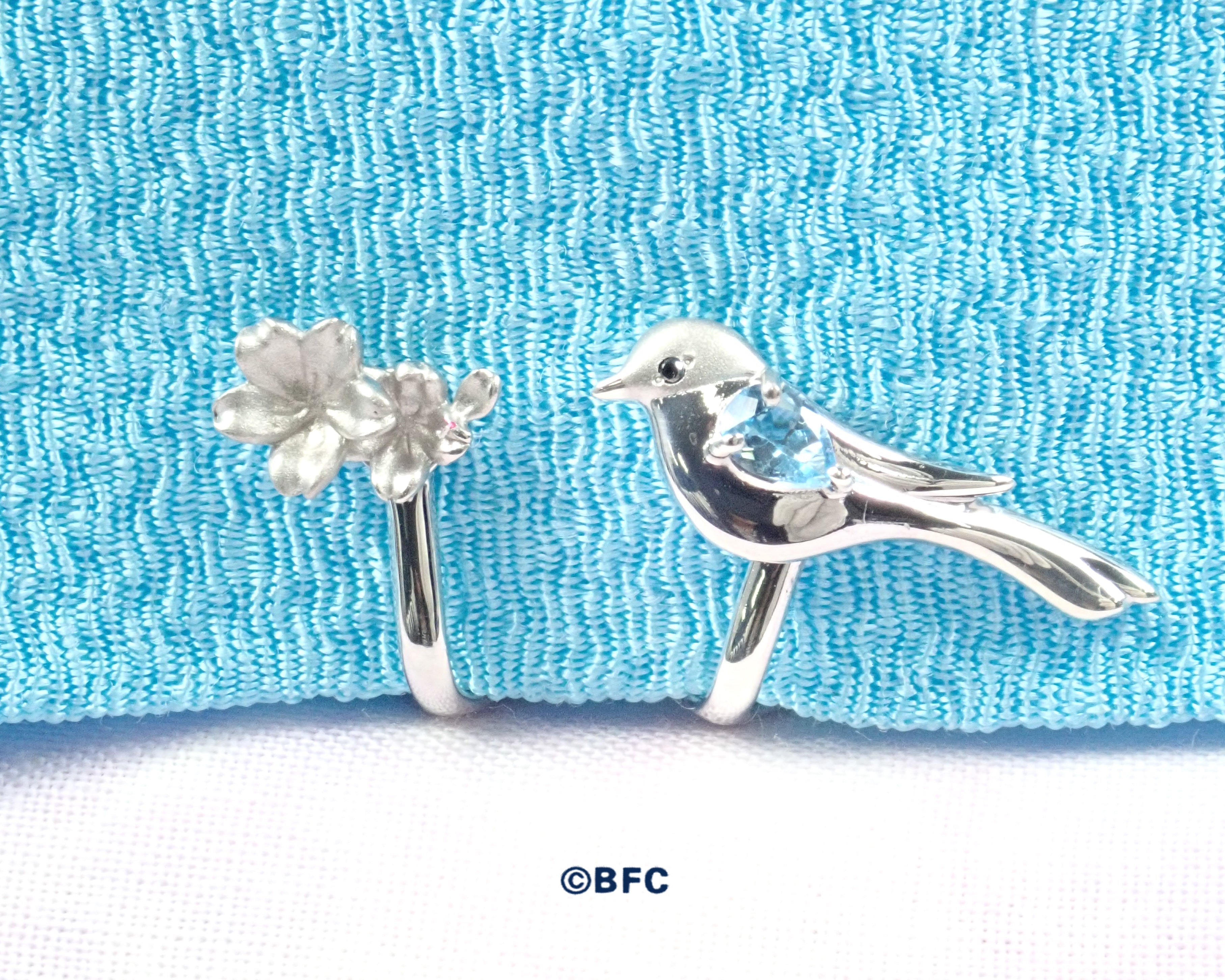 設計將青尾鵲(青尾高中的象徵)與故事中出現的櫻池橋的櫻花融為一體。眼睛和翅膀分別鑲嵌黑鑽石和天藍色托帕石。可愛的表情和長長的尾巴是其魅力所在。青尾鵲的頭部和櫻花則採用了珠寶製作中常用的霧面工藝。每一件都經過精心打磨,讓您可以欣賞到它們的美麗和立體感。重點是左右耳朵的設計各不相同,而吊墜和戒指則統一了外觀。根據心情更換配戴方向,可以從兩個角度欣賞不同的世界觀。