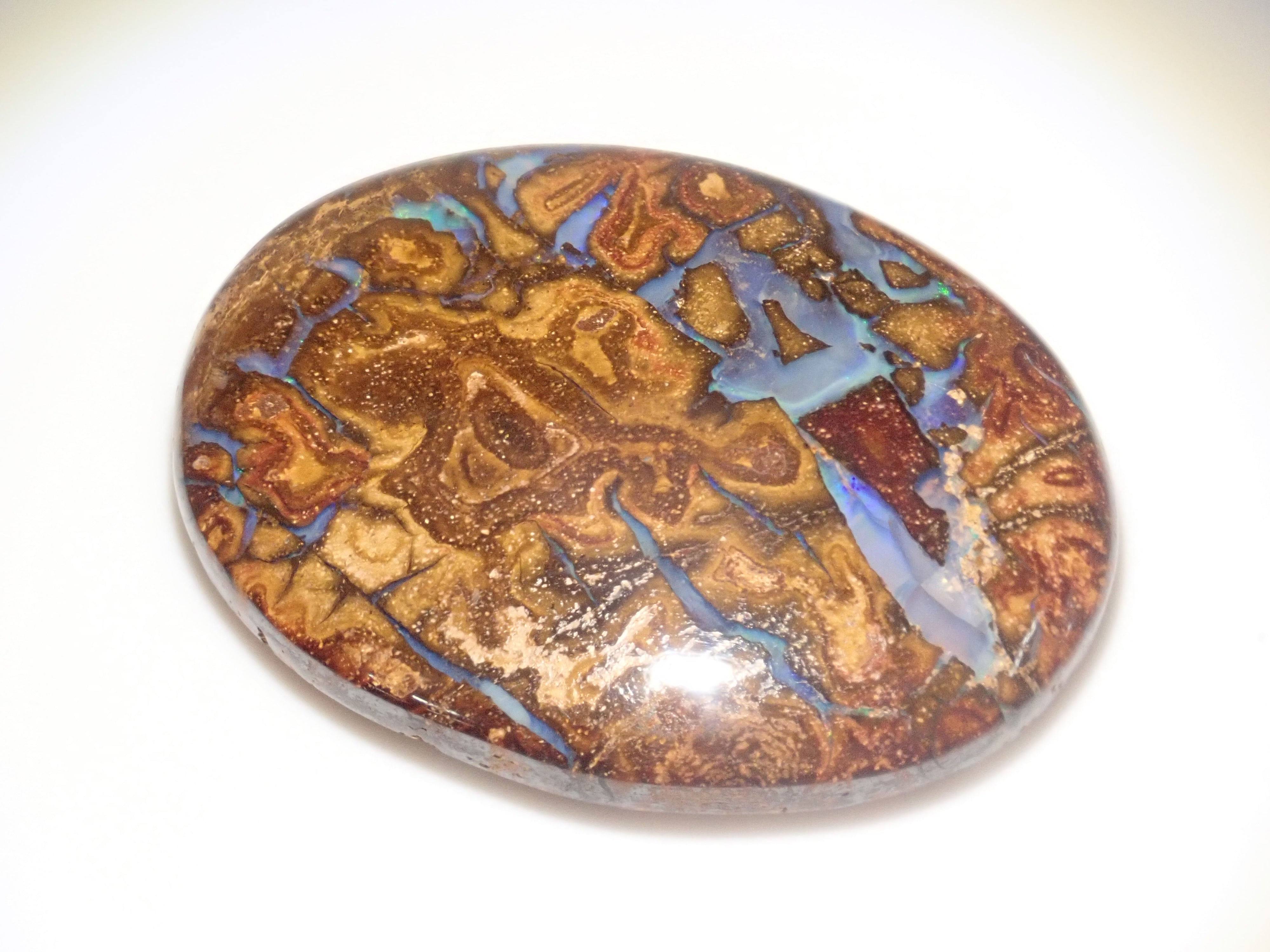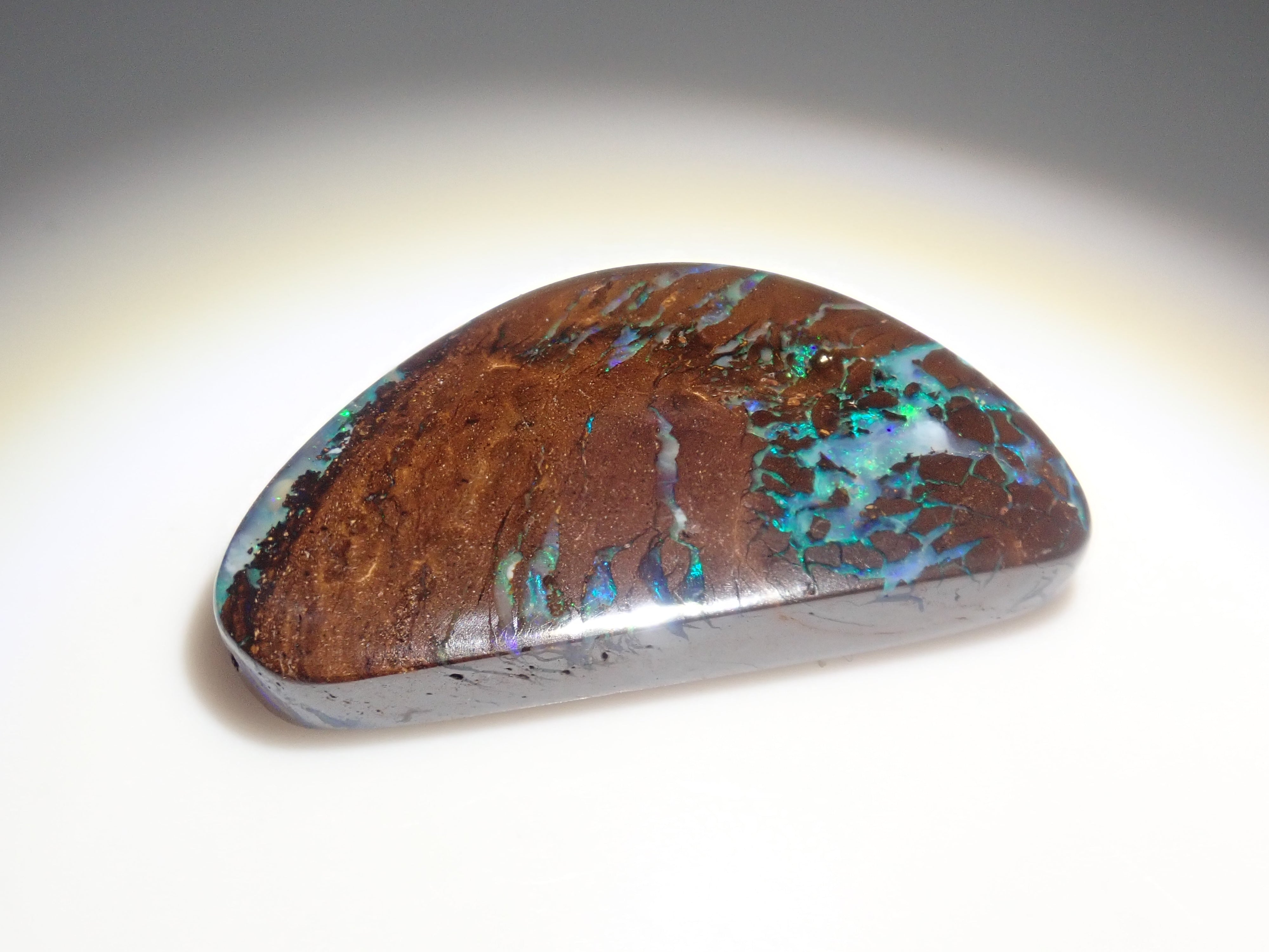 來自昆士蘭的鐵蛋白石。這種蛋白石僅產於澳洲某些地區,具有獨特的含鐵結構,其特徵是顏色強烈、光澤美麗。紅、橙、棕、綠等多種顏色遍佈整塊石頭,形成一幅幅大自然繪製的山水畫般的圖案。