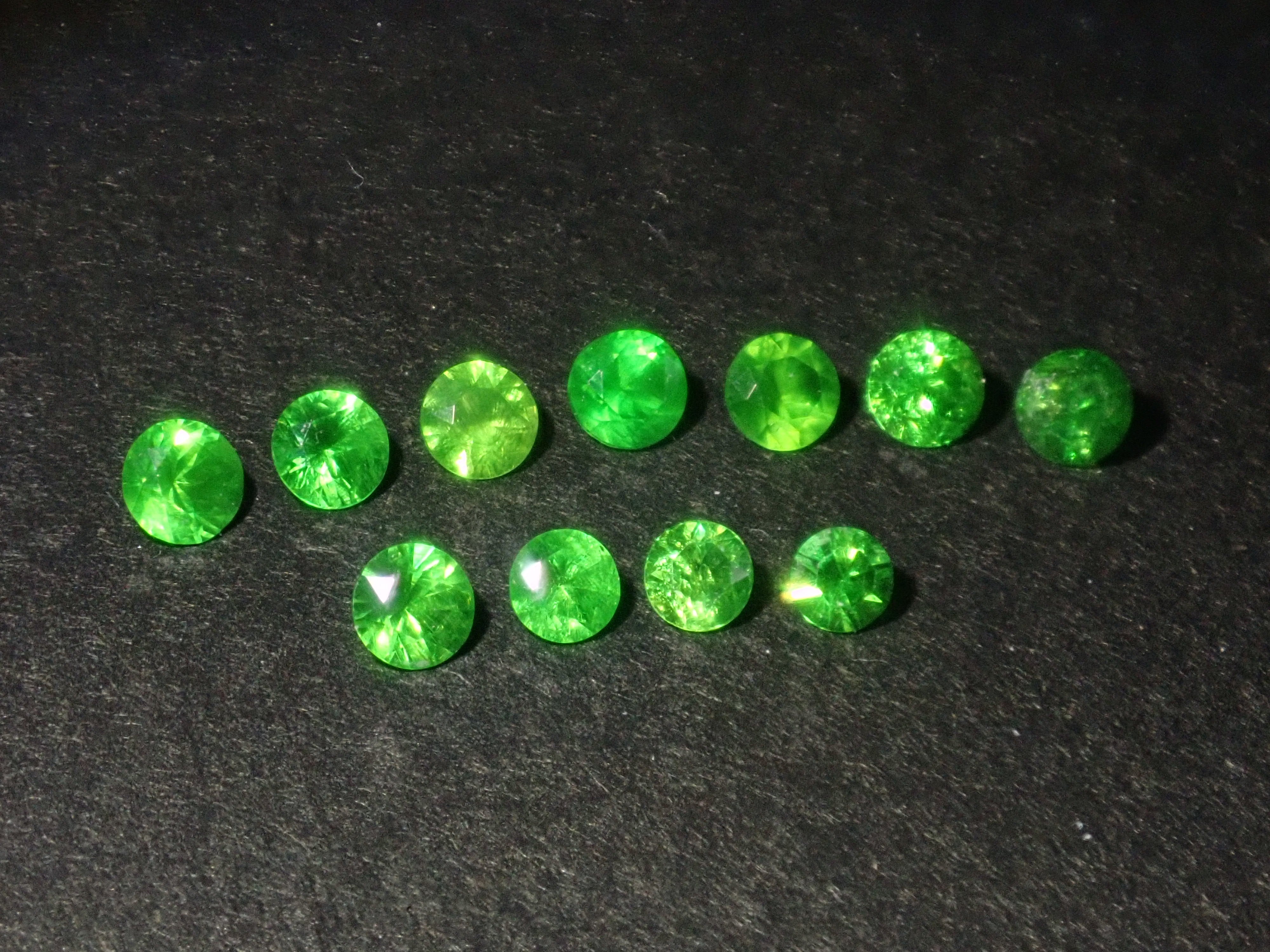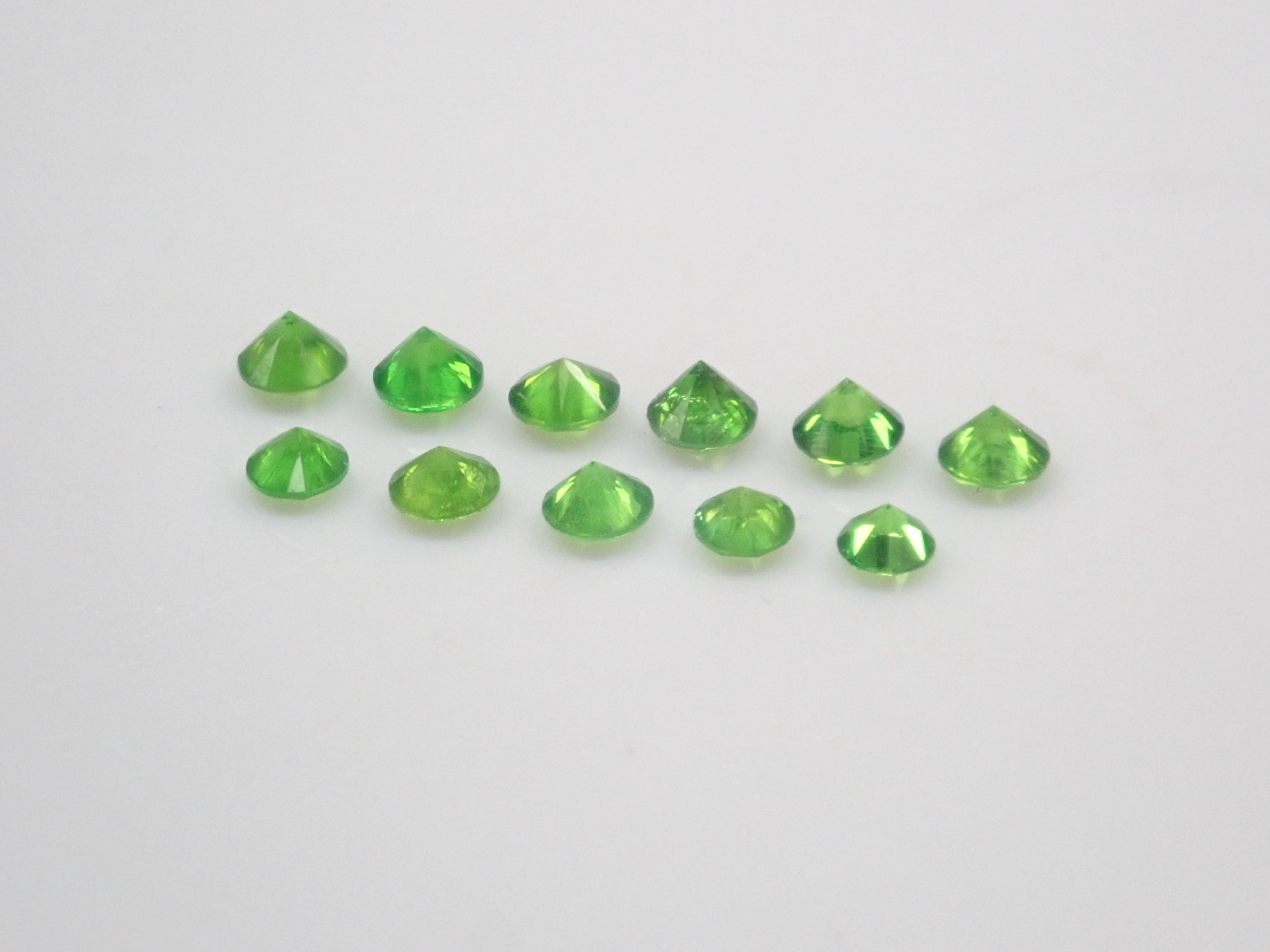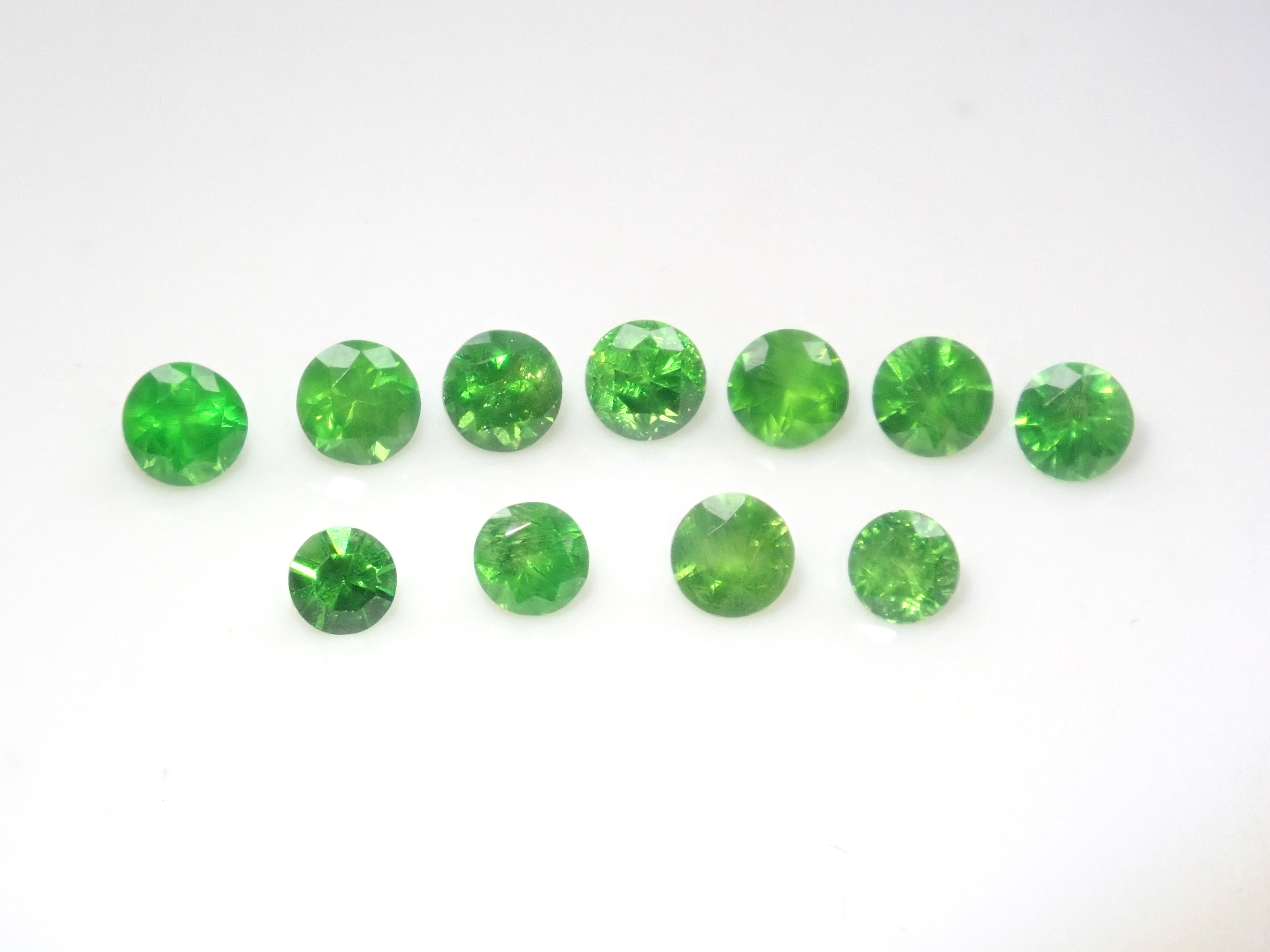 石榴石色散性強,閃耀奪目。其中,綠色的「翠綠石榴石」特別美麗罕見。這顆俄羅斯翠綠石榴石色澤深邃,帶有馬尾紋。尺寸呈圓形,直徑約 2.0-2.3 毫米。您將收到照片中 11 顆寶石中的一顆。