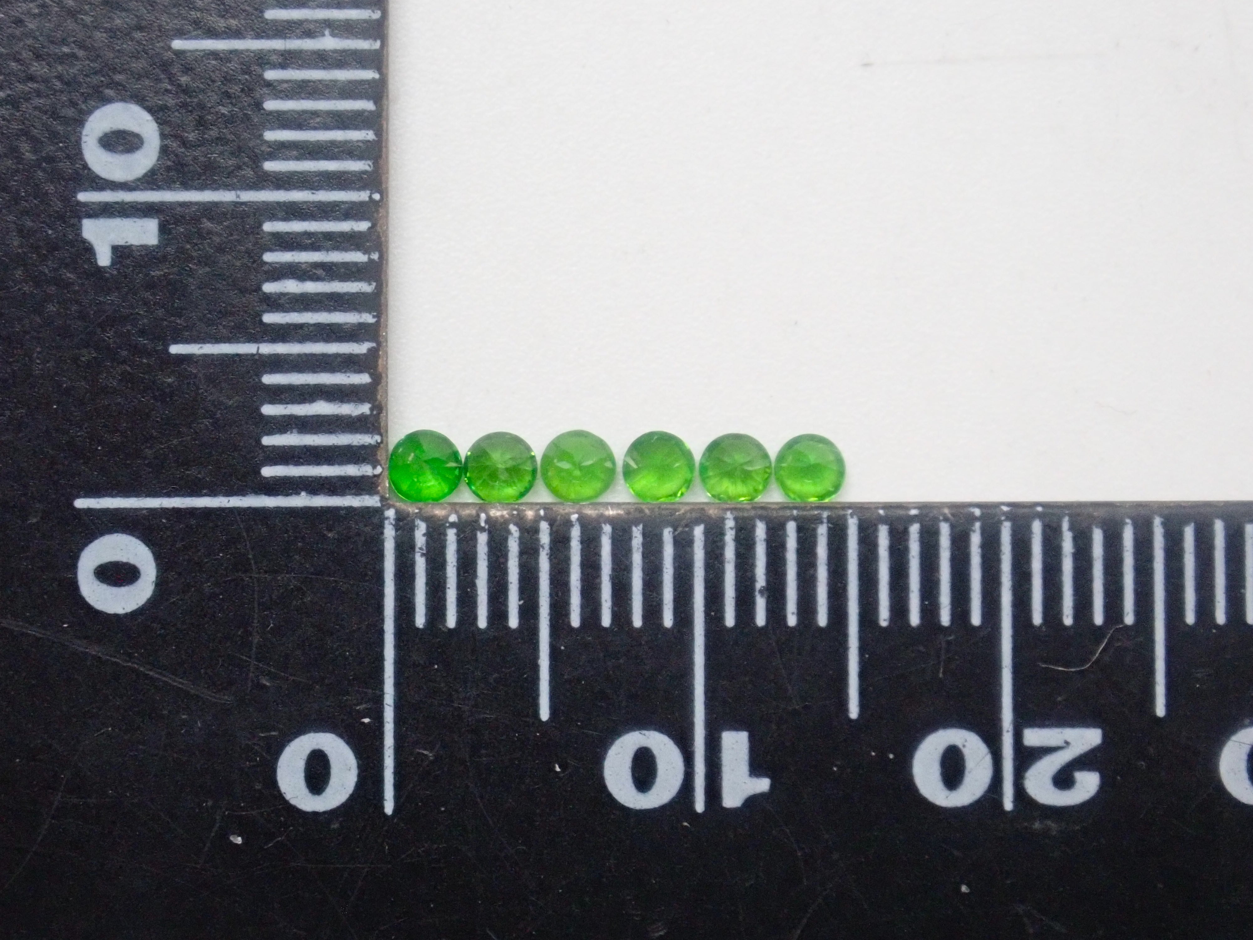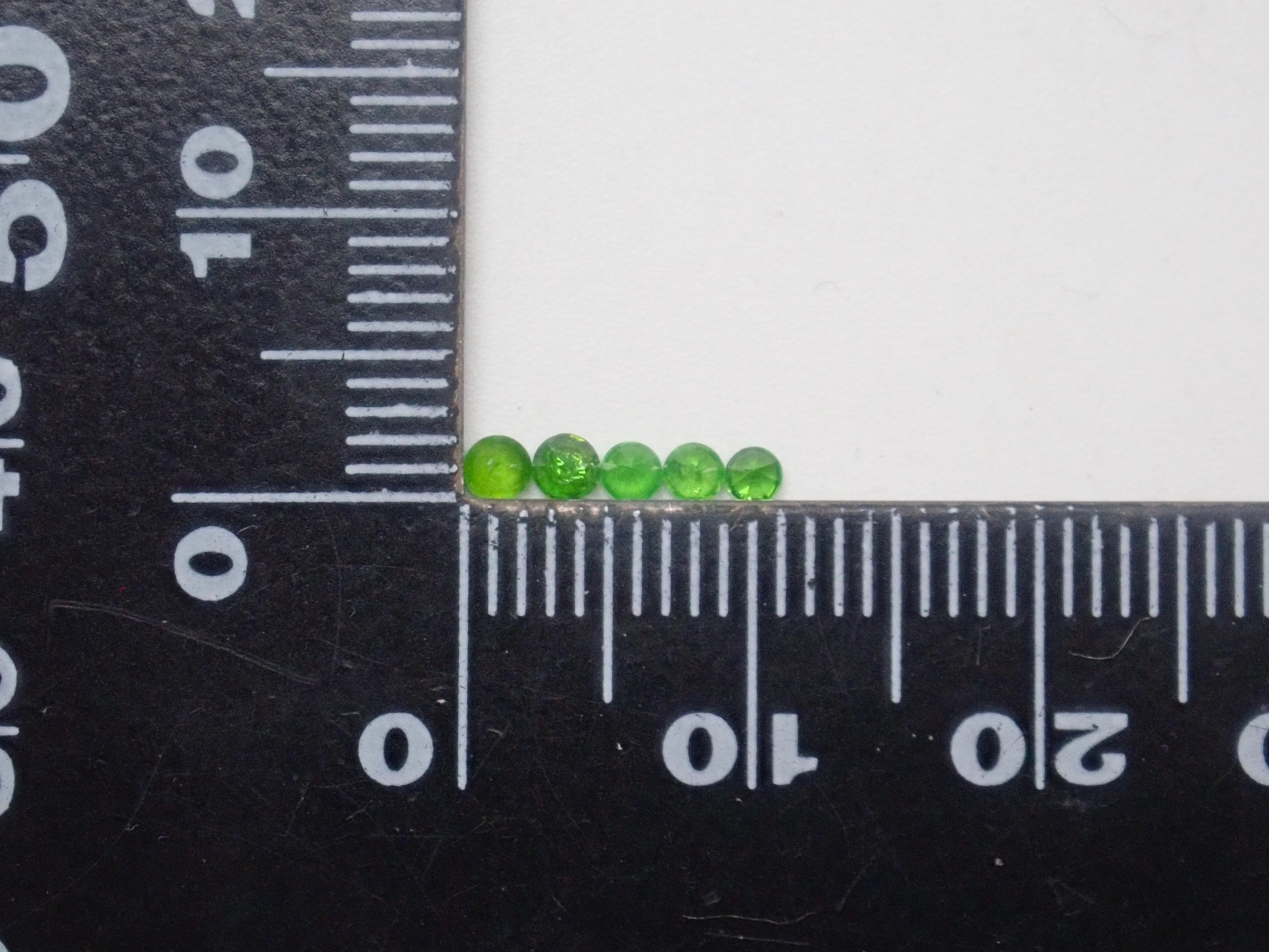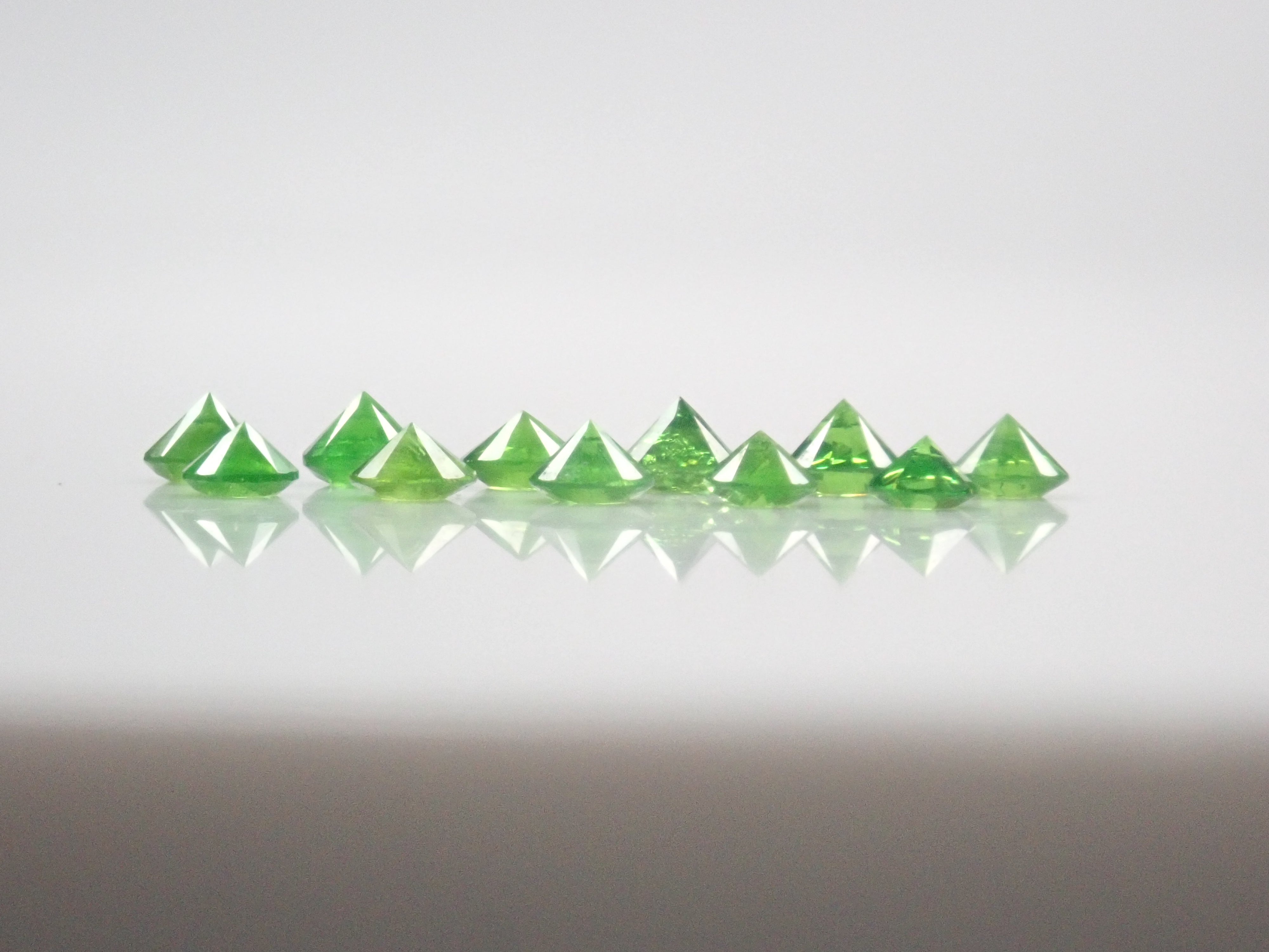 石榴石色散性強,閃耀奪目。其中,綠色的「翠綠石榴石」特別美麗罕見。這顆俄羅斯翠綠石榴石色澤深邃,帶有馬尾紋。尺寸呈圓形,直徑約 2.0-2.3 毫米。您將收到照片中 11 顆寶石中的一顆。
