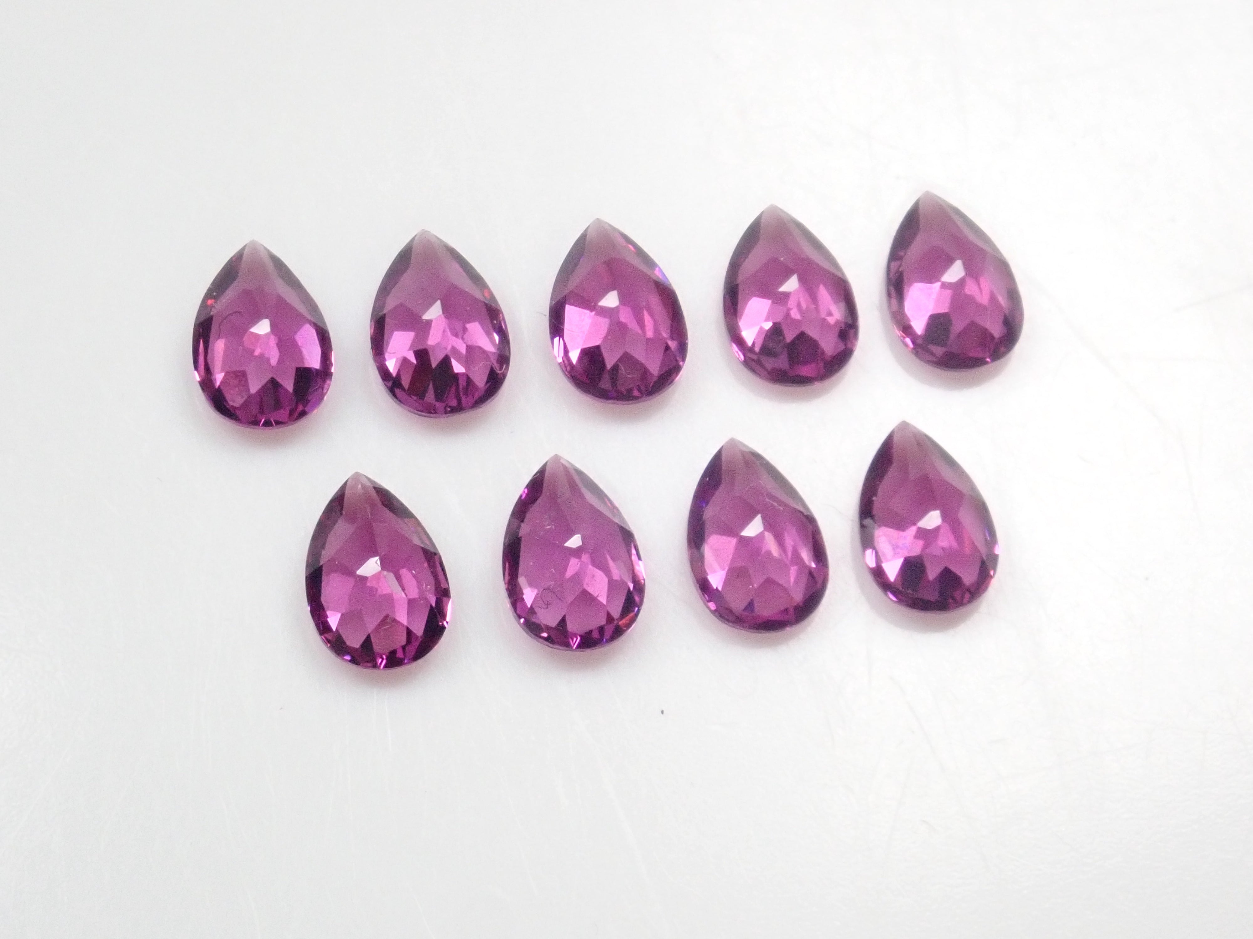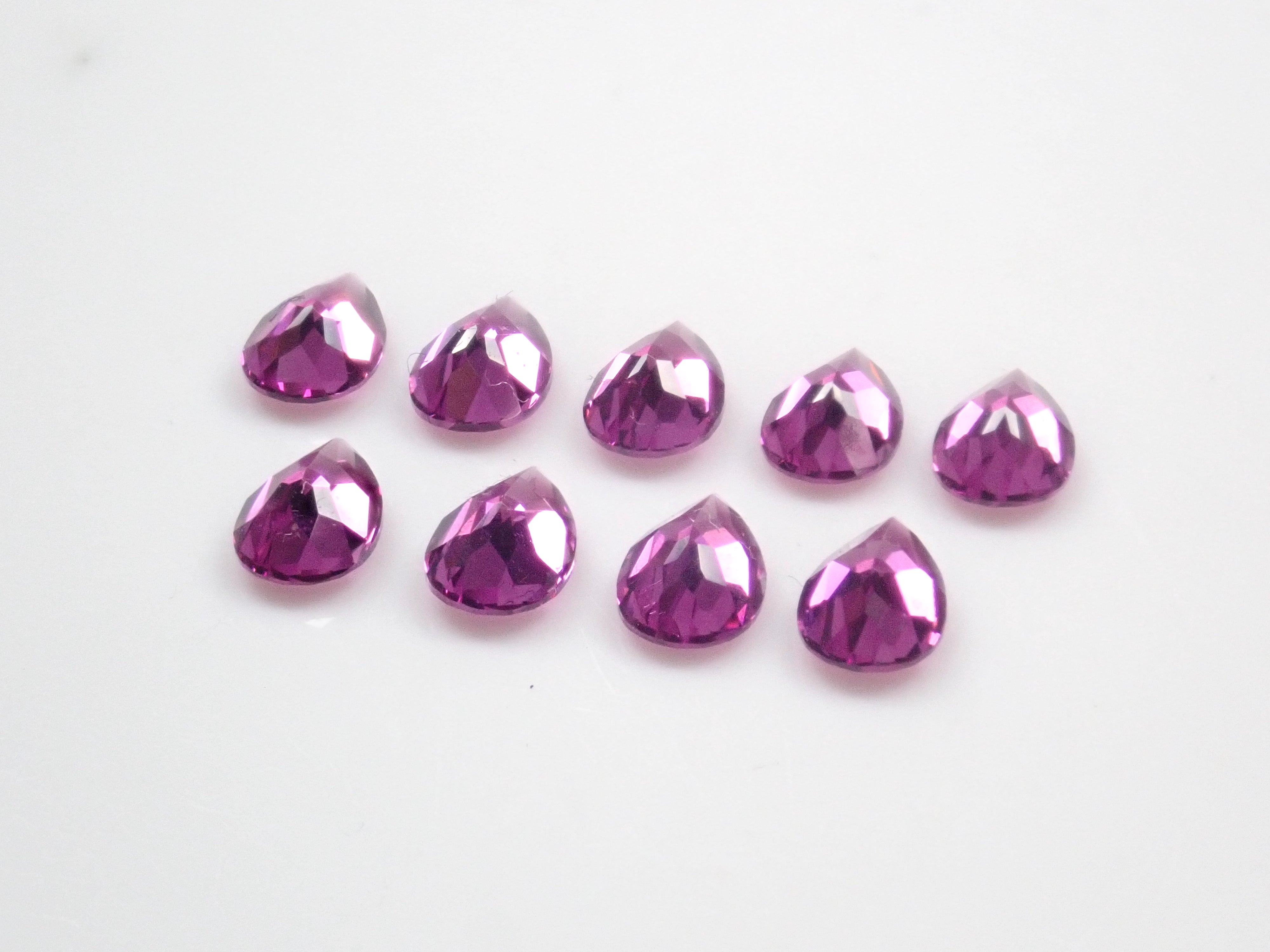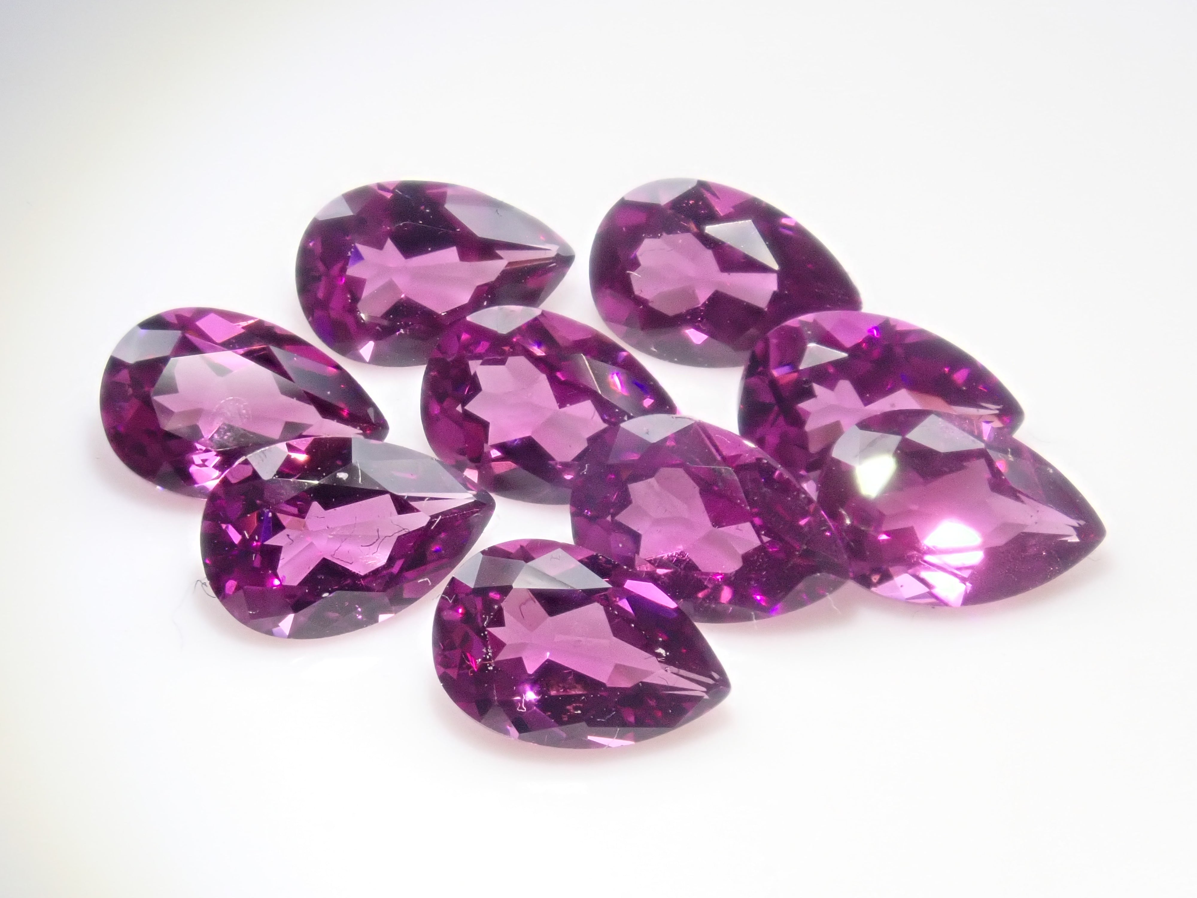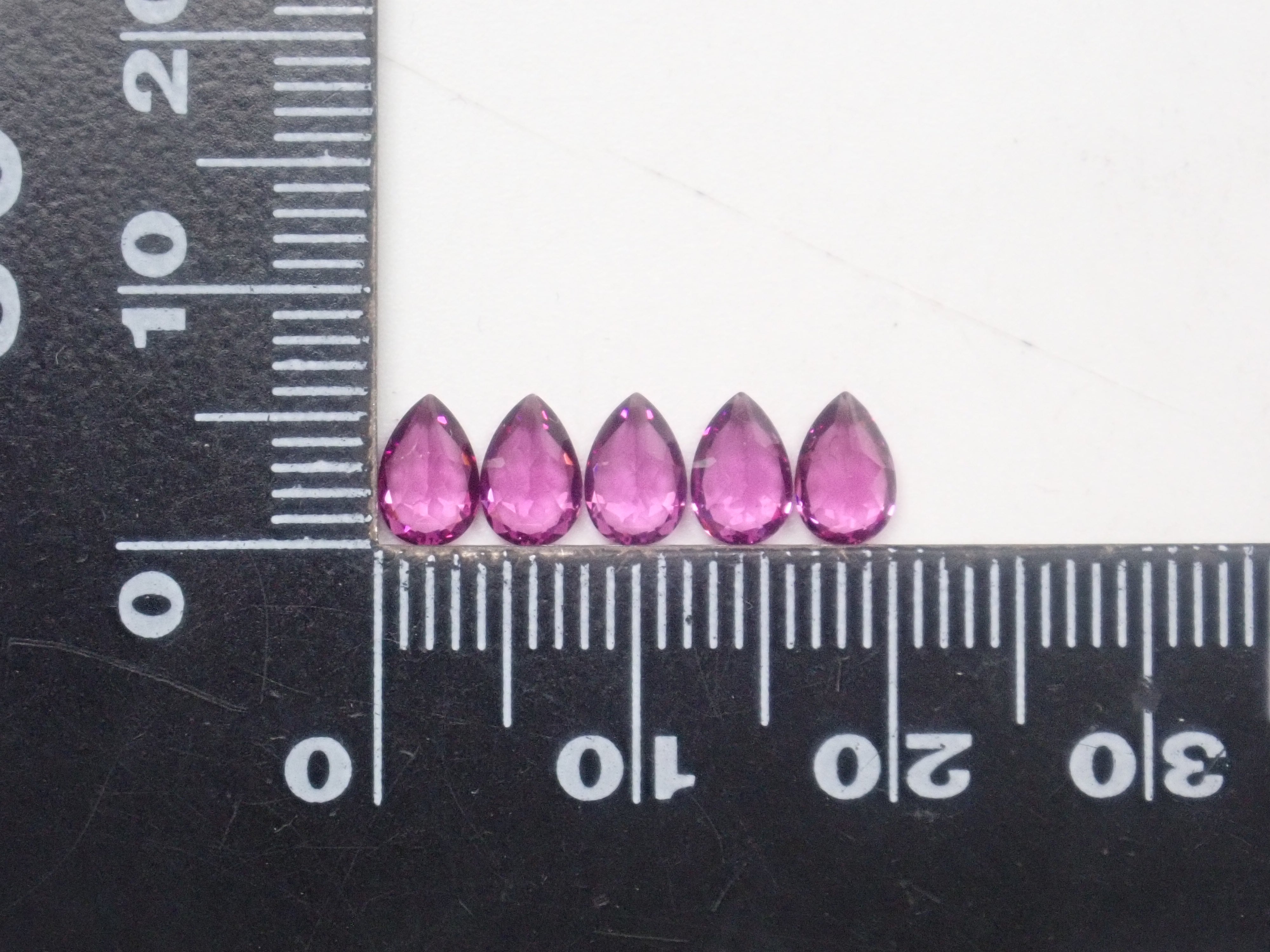 這是一顆透明度特別高、顏色特別深的葡萄石榴石。它呈梨形切割,尺寸為4 x 6毫米。