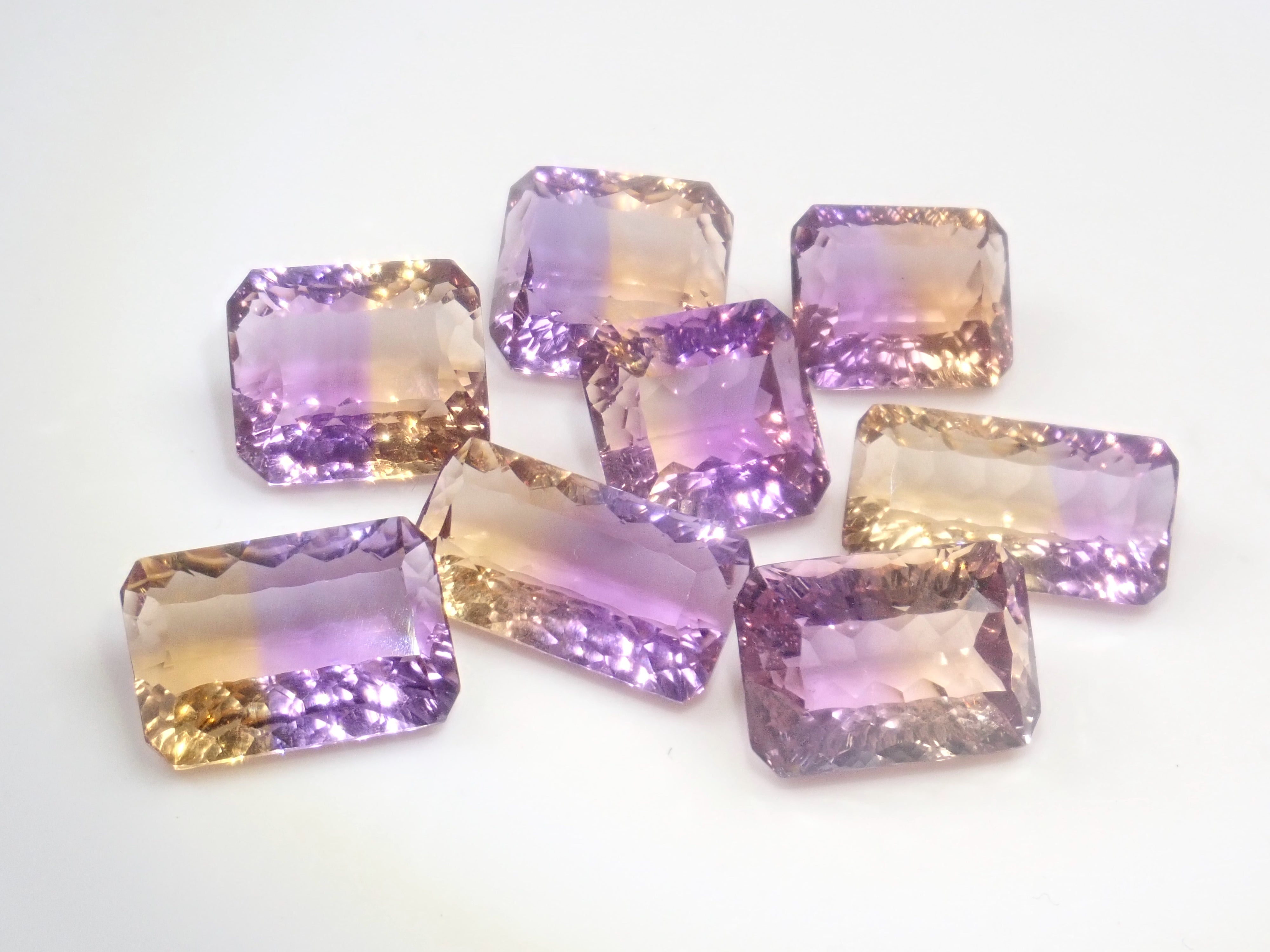紫黃晶兼具紫水晶的紫色和黃水晶的黃色。紫水晶和黃水晶都屬於石英(水晶),其寶石名稱中稱為“雙色石英”,日文中則稱為“紫黃晶”。這顆紫黃晶經過精心挑選,透明度極高,尺寸驚人。它採用凹面切割,平均重量為7.2克拉。請參考照片,用尺測量每顆紫黃晶的尺寸。