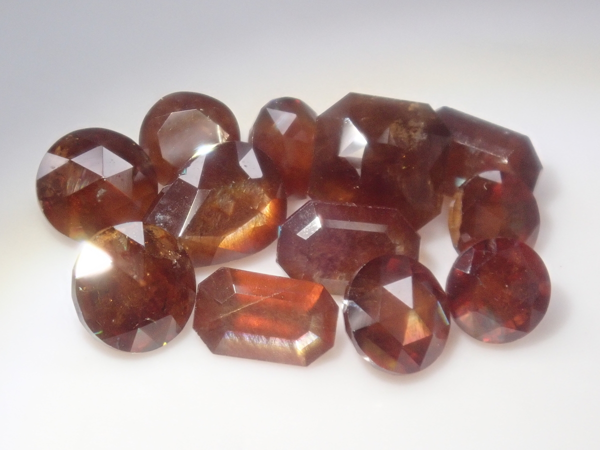 スリランカ研磨職人サンジェ氏カットのファセットカットの限定14石のレインボーガーネットです。奈良県の天川村産で、カットはサンジェ氏が手掛けています。サイズは平均0.5ct、一番大きいものは2.3ctです。単品販売基準に満たないものも含みますが、どれもカットにこだわったレインボーガーネットです。